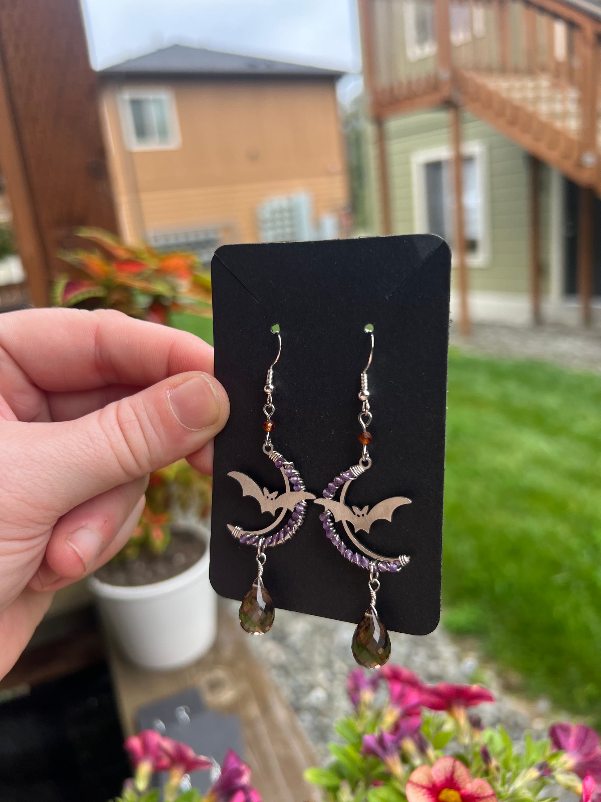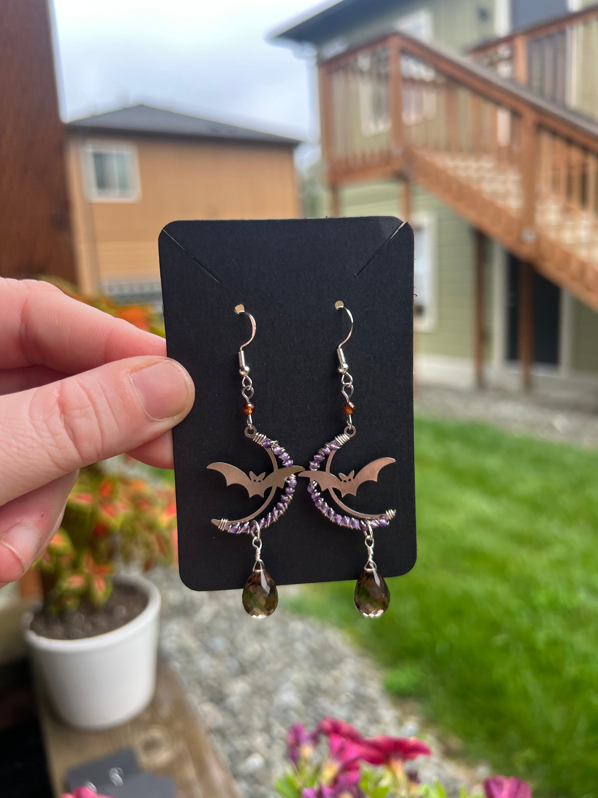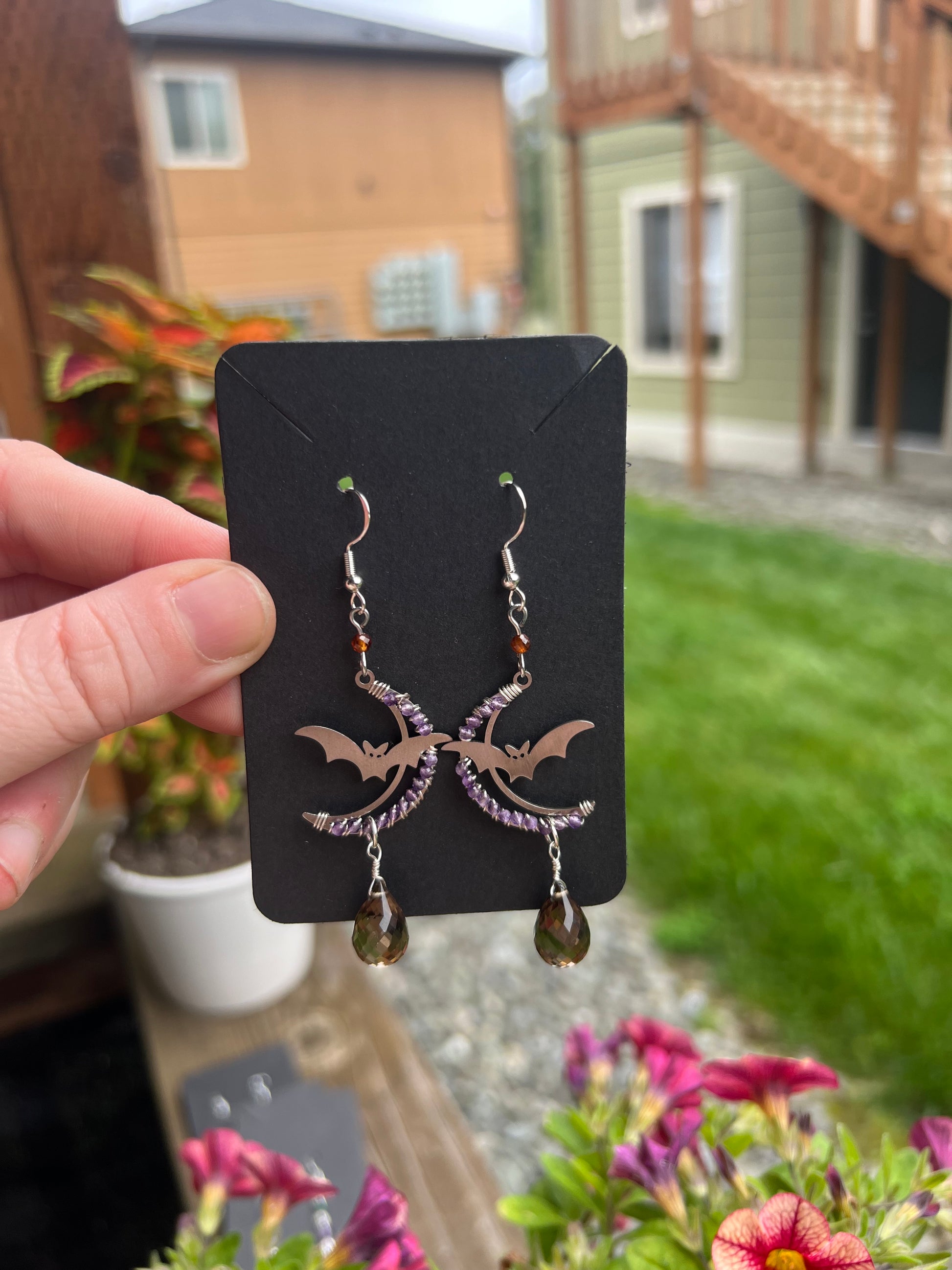 Bat Crescent moon charm earrings paired with multiple amethyst beads, garnet, and smoky tear drop beads, .925 hooks, medium weight