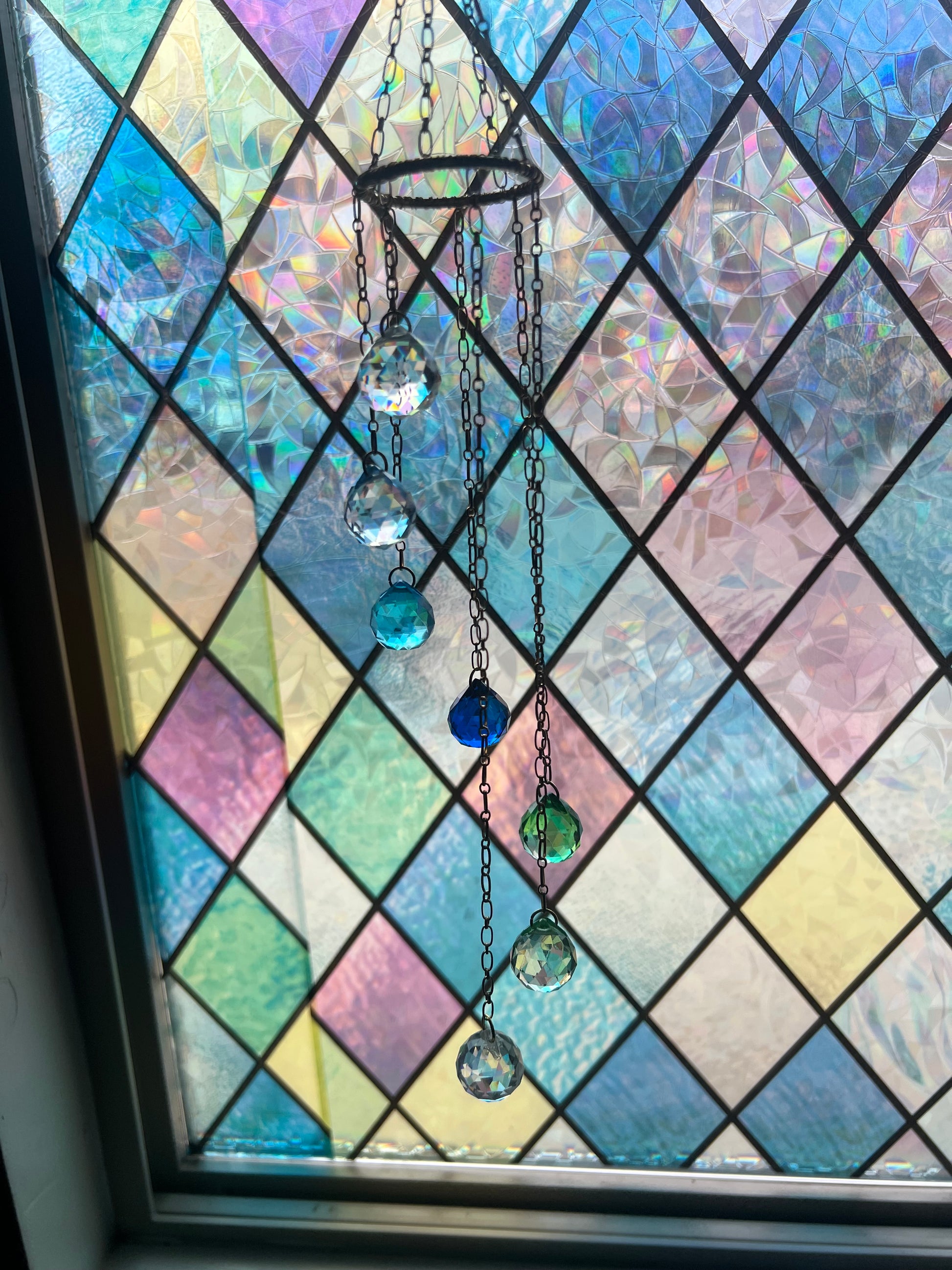 Suncatcher, delicately wrapped gold wire and chains paired with various colored prism beads, comes with hanging hook