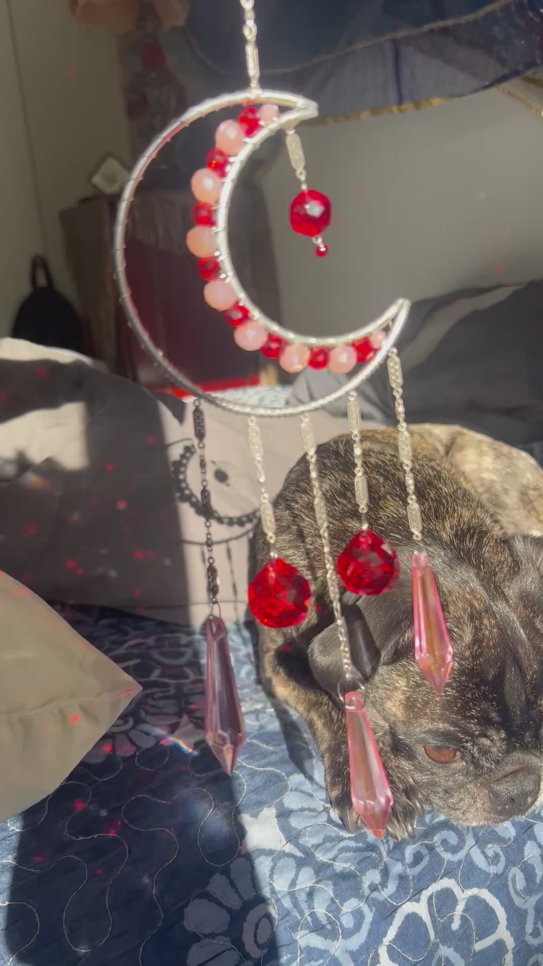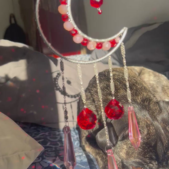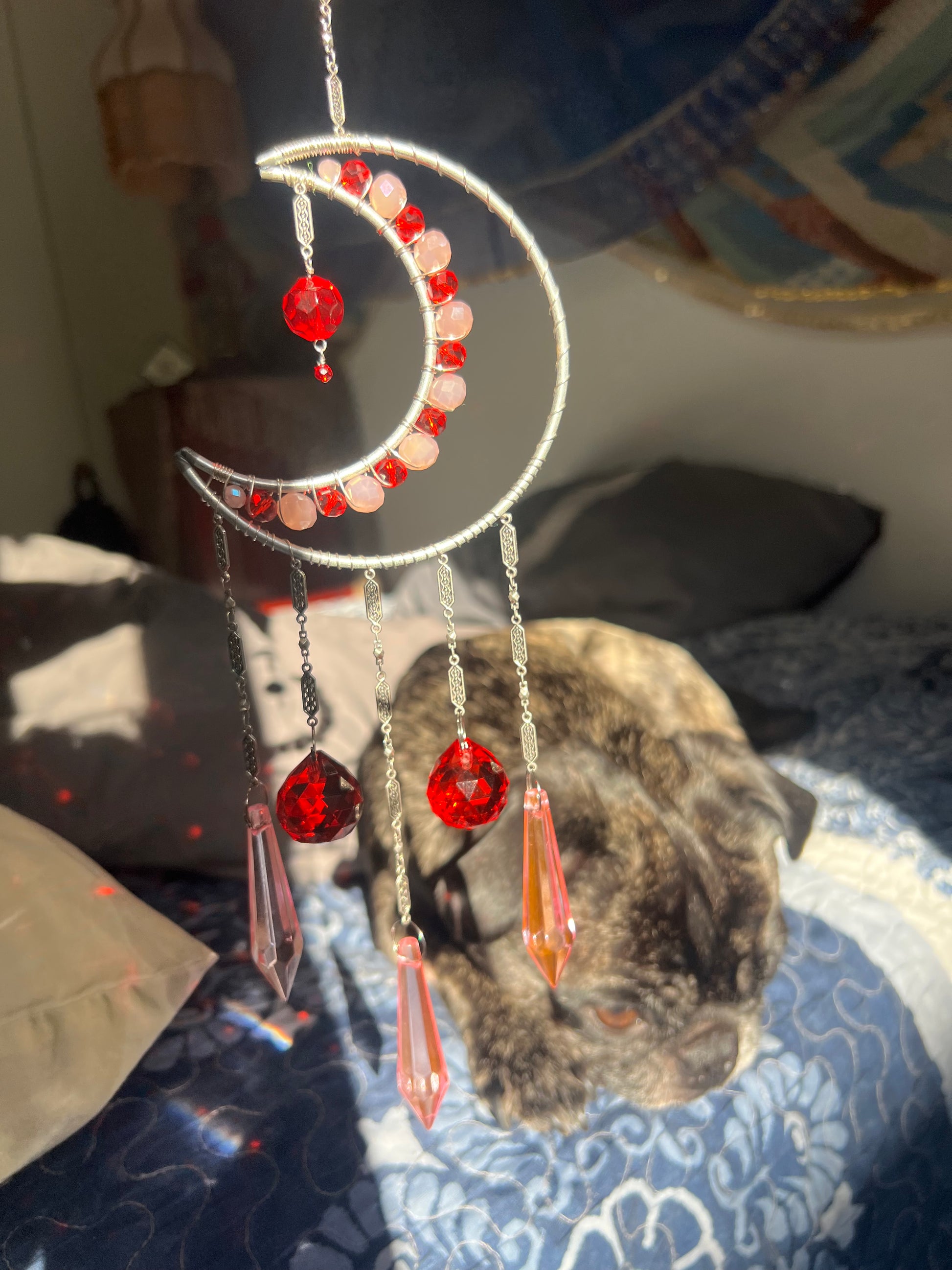 Crescent moon suncatcher made with plated silver wire, chains and various prism beads