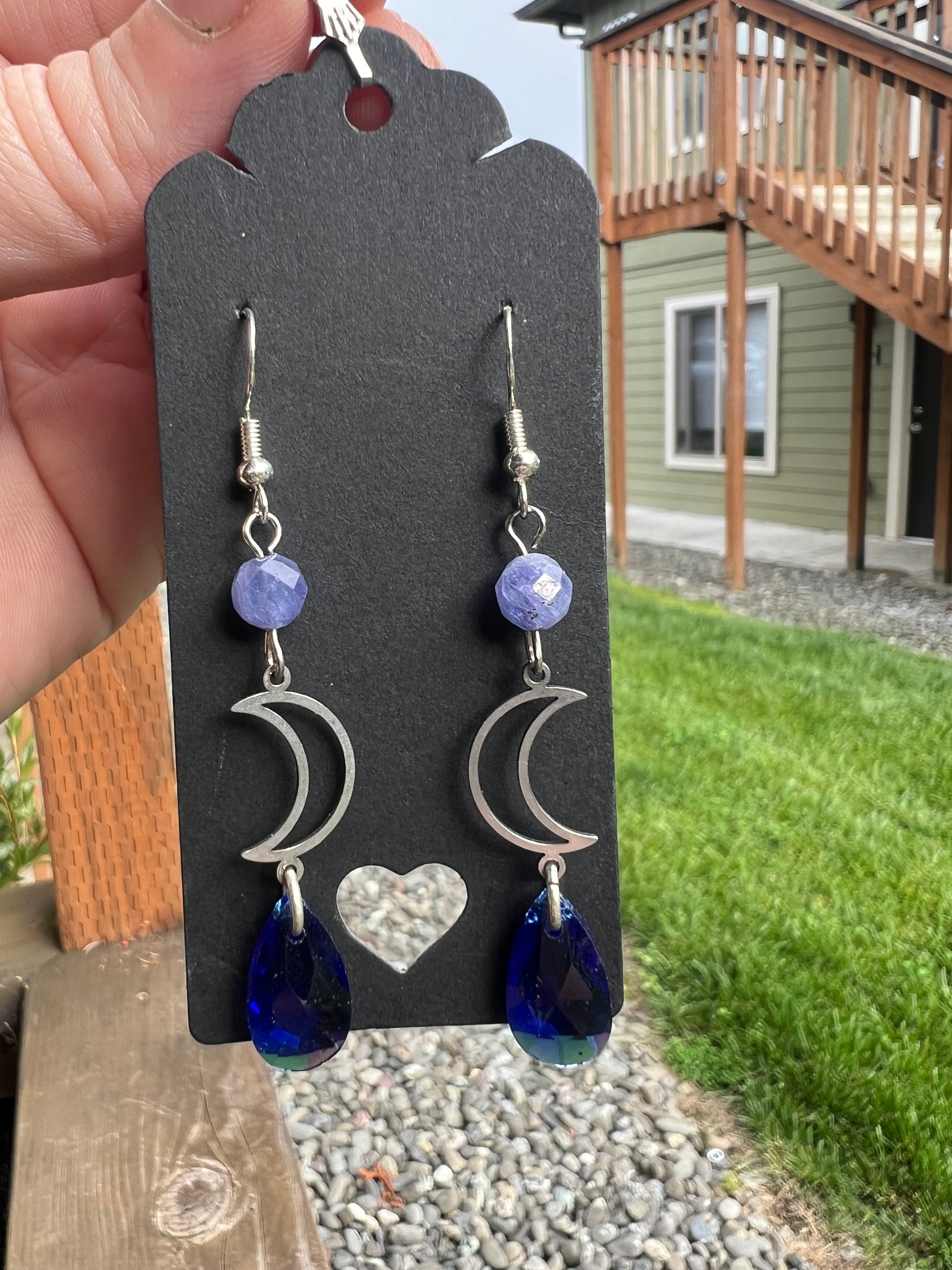 Crescent moon earrings paired with Tanzanite facet beads, silver moon charms and blue suncatcher cbeads, .925 hooks, lightweight