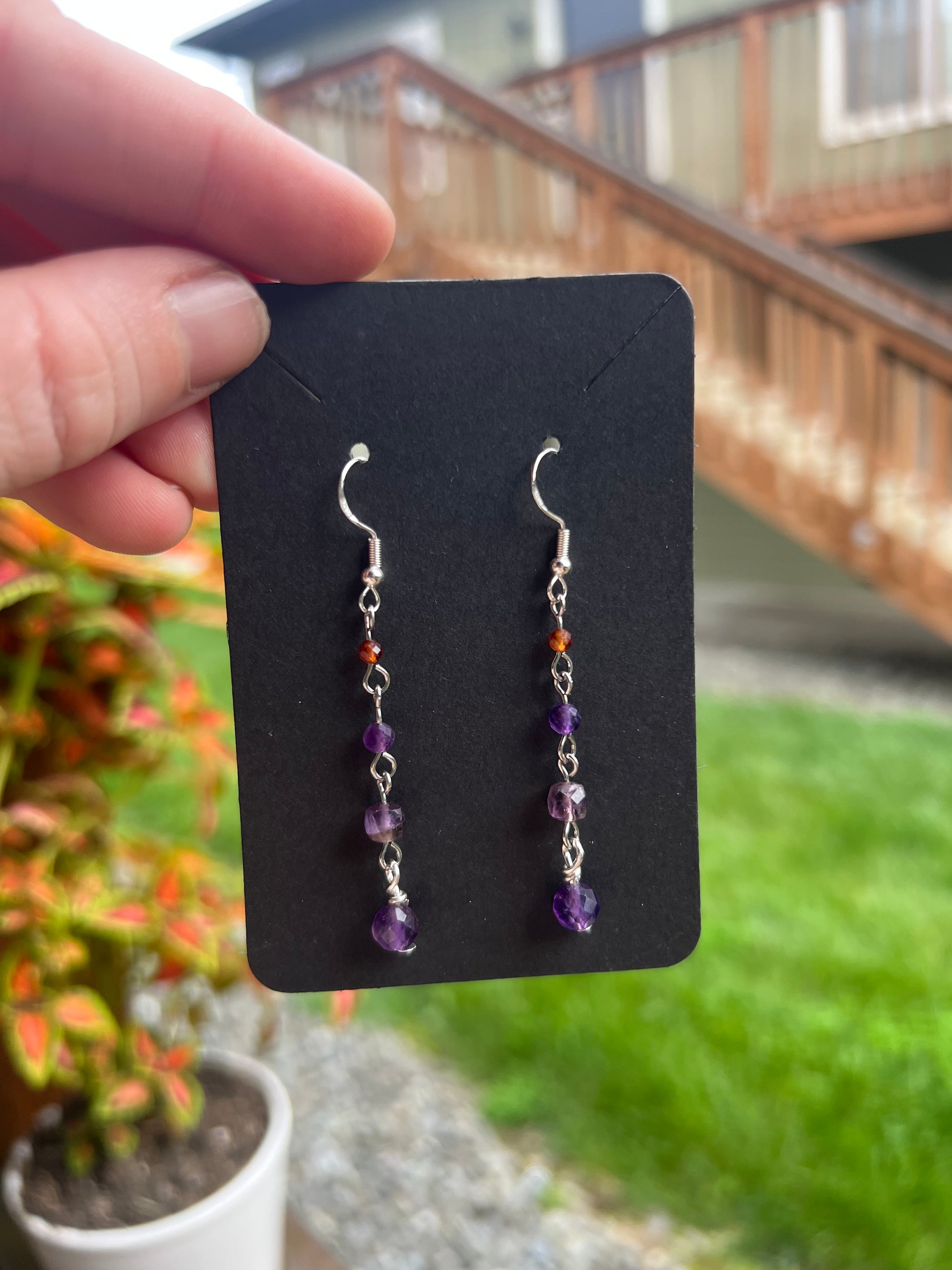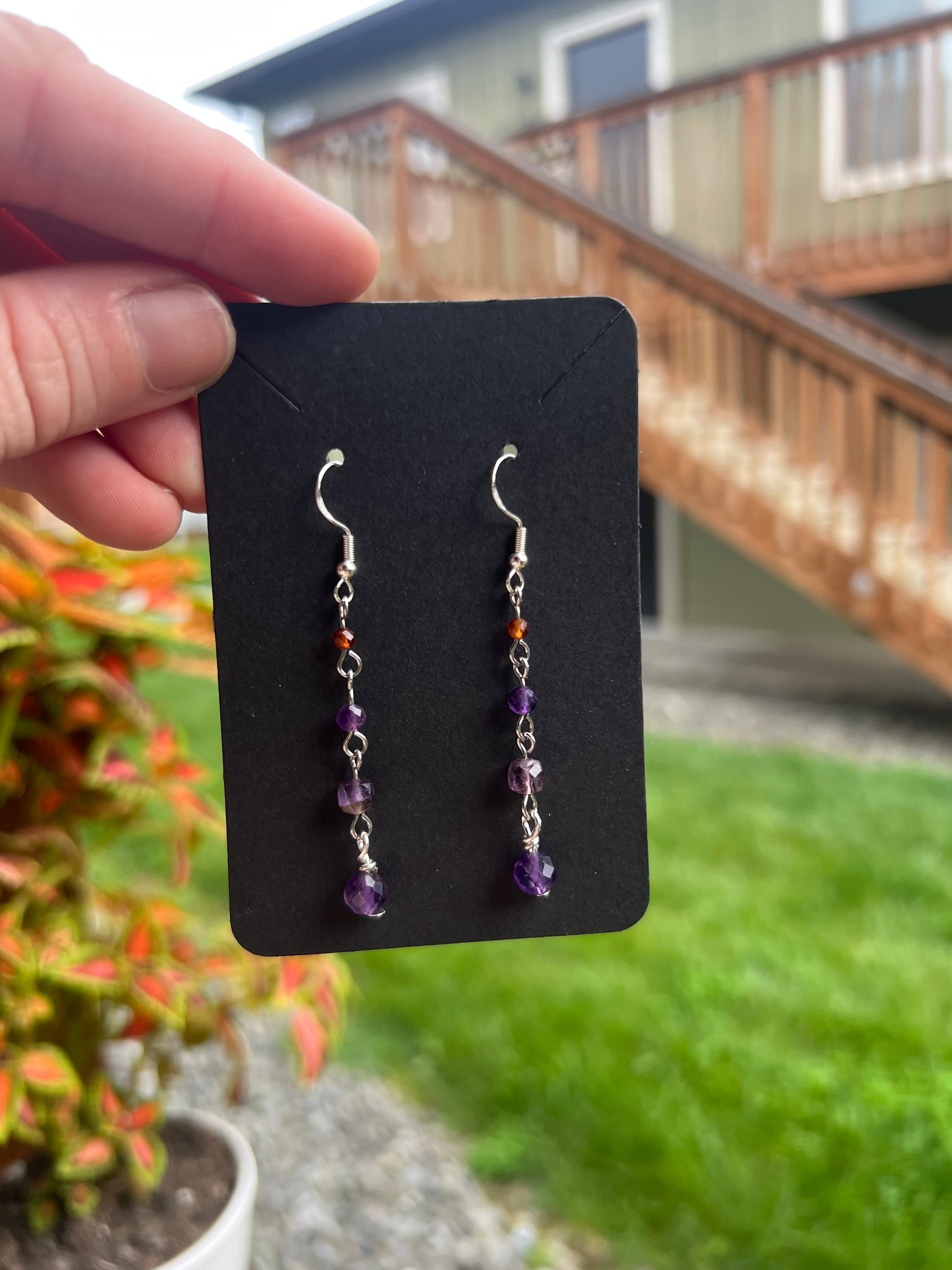 Amethyst and Garnet dangle style earrings, .925 hooks, light weight
