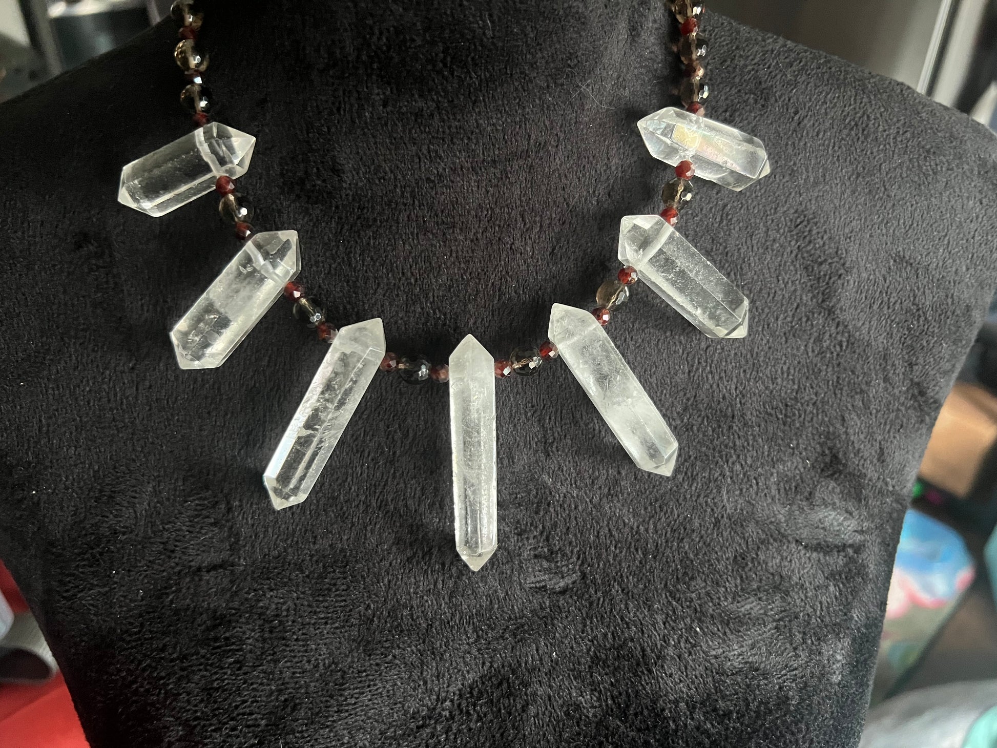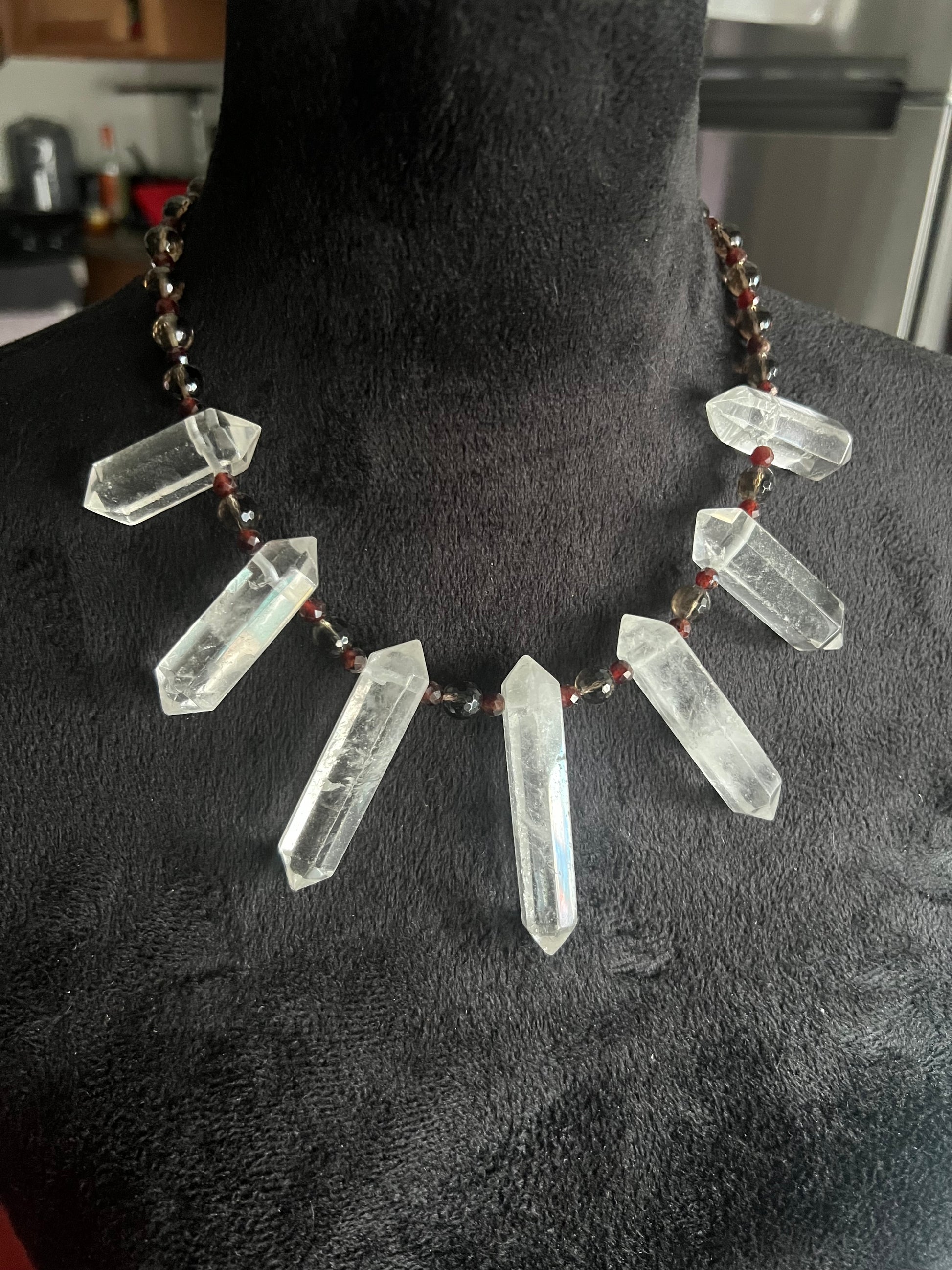7 quartz points with facet garnet and smoky quartz beading, 18.5 inches