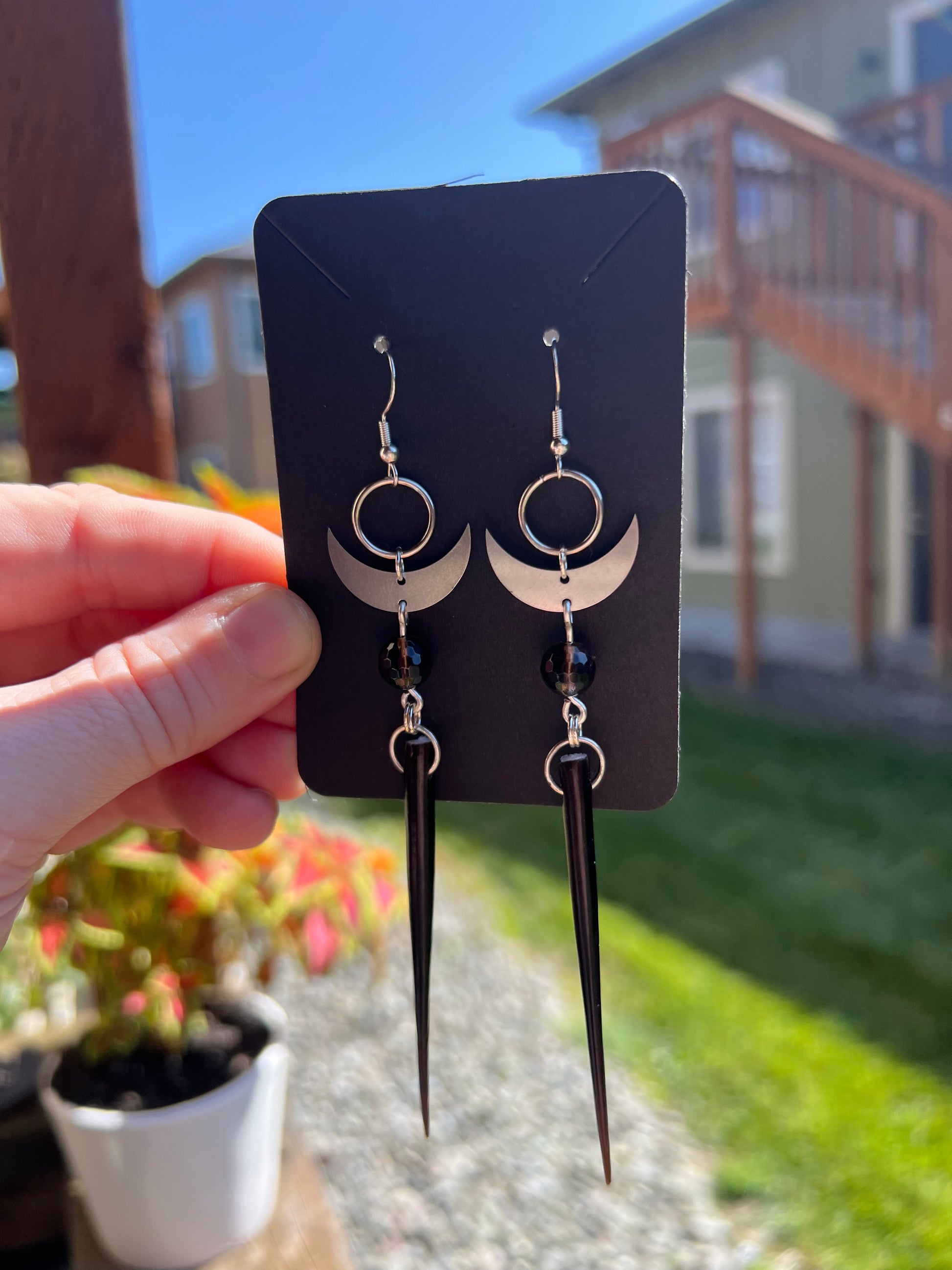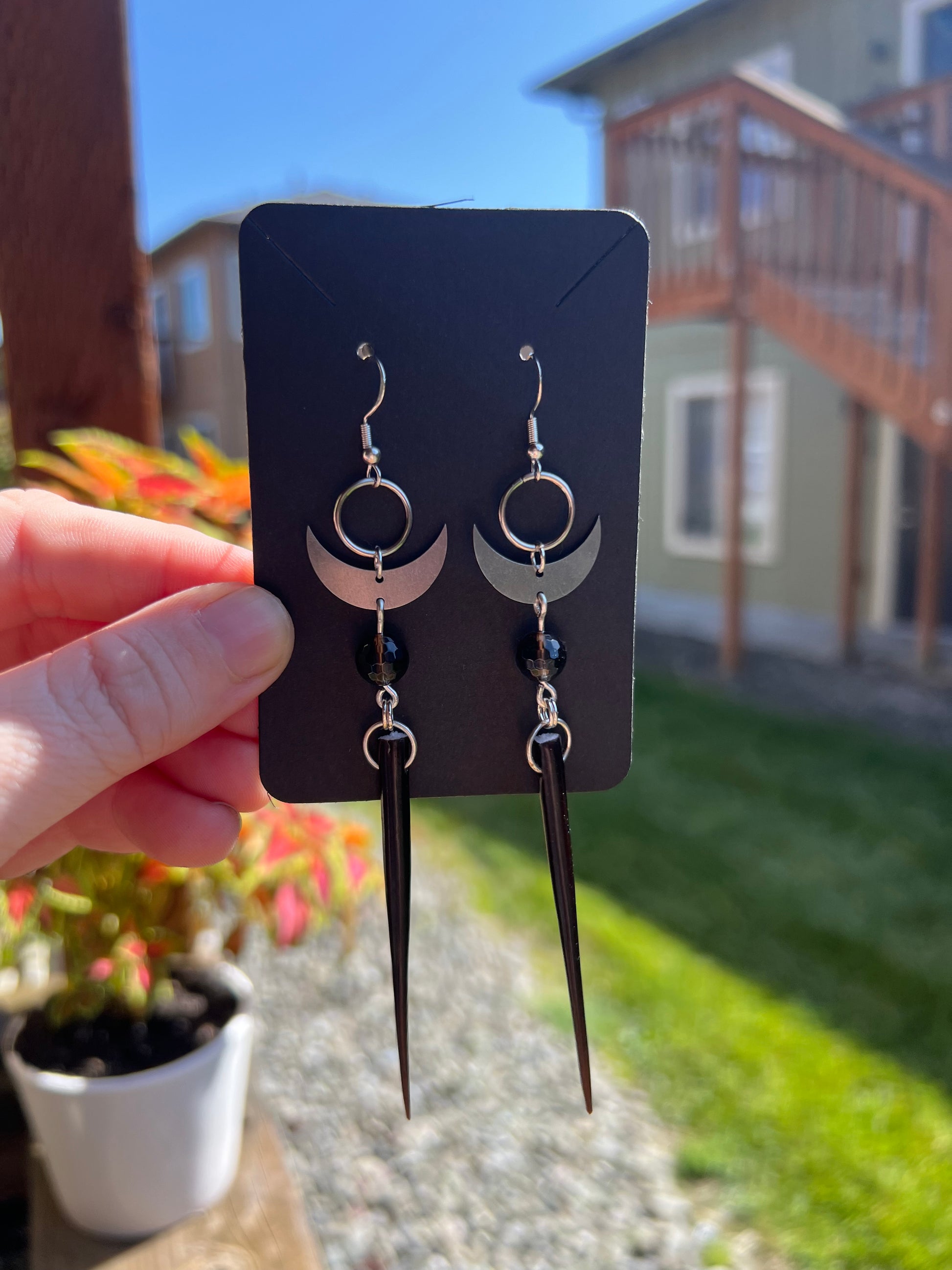 Black porcupine quill earrings with silver moon charms and Smoky Quartz beads, .925 hooks, light-medium weight