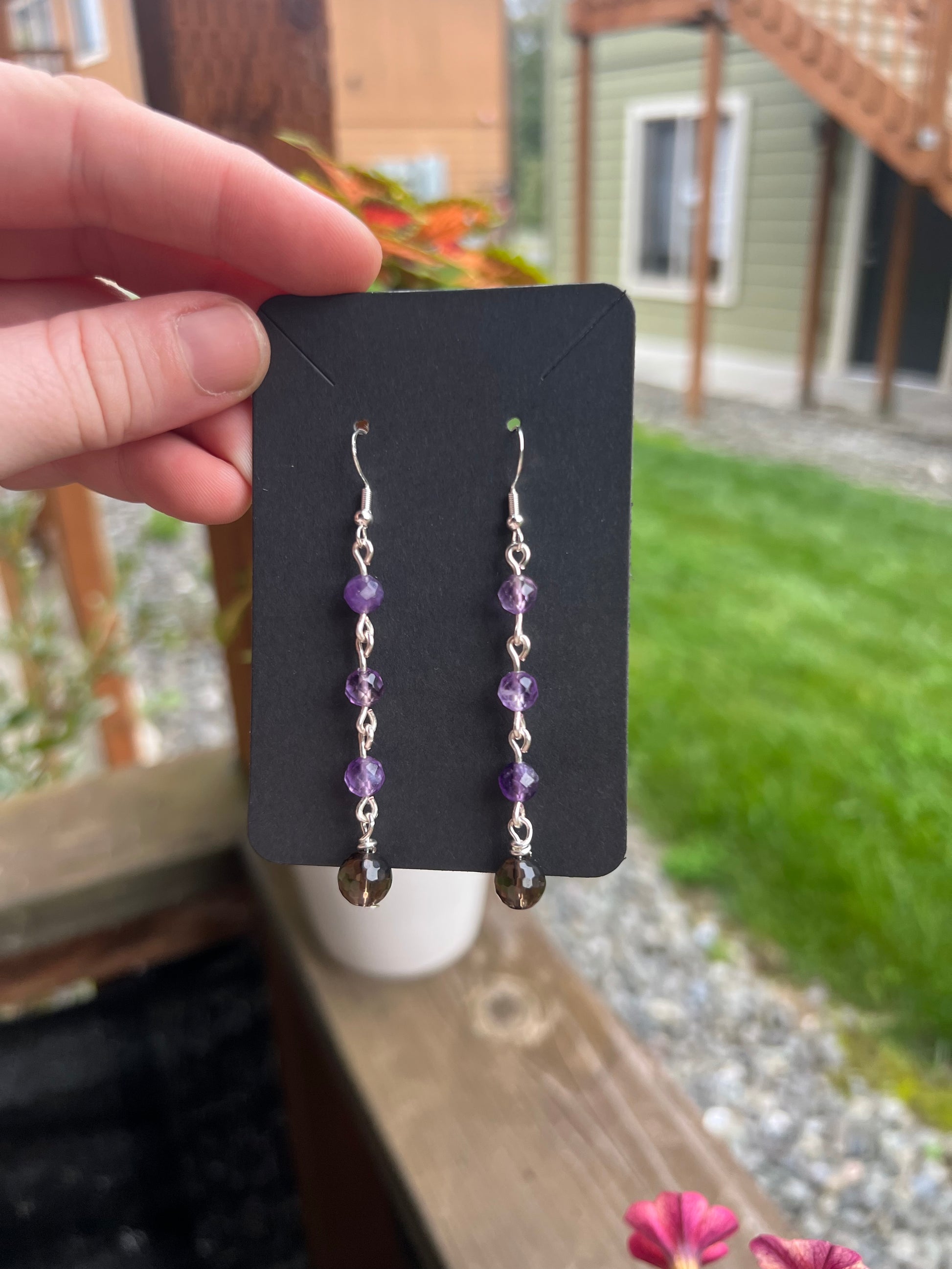Smoky Quartz and Amethyst dangle style earrings, .925 hooks, lightweight