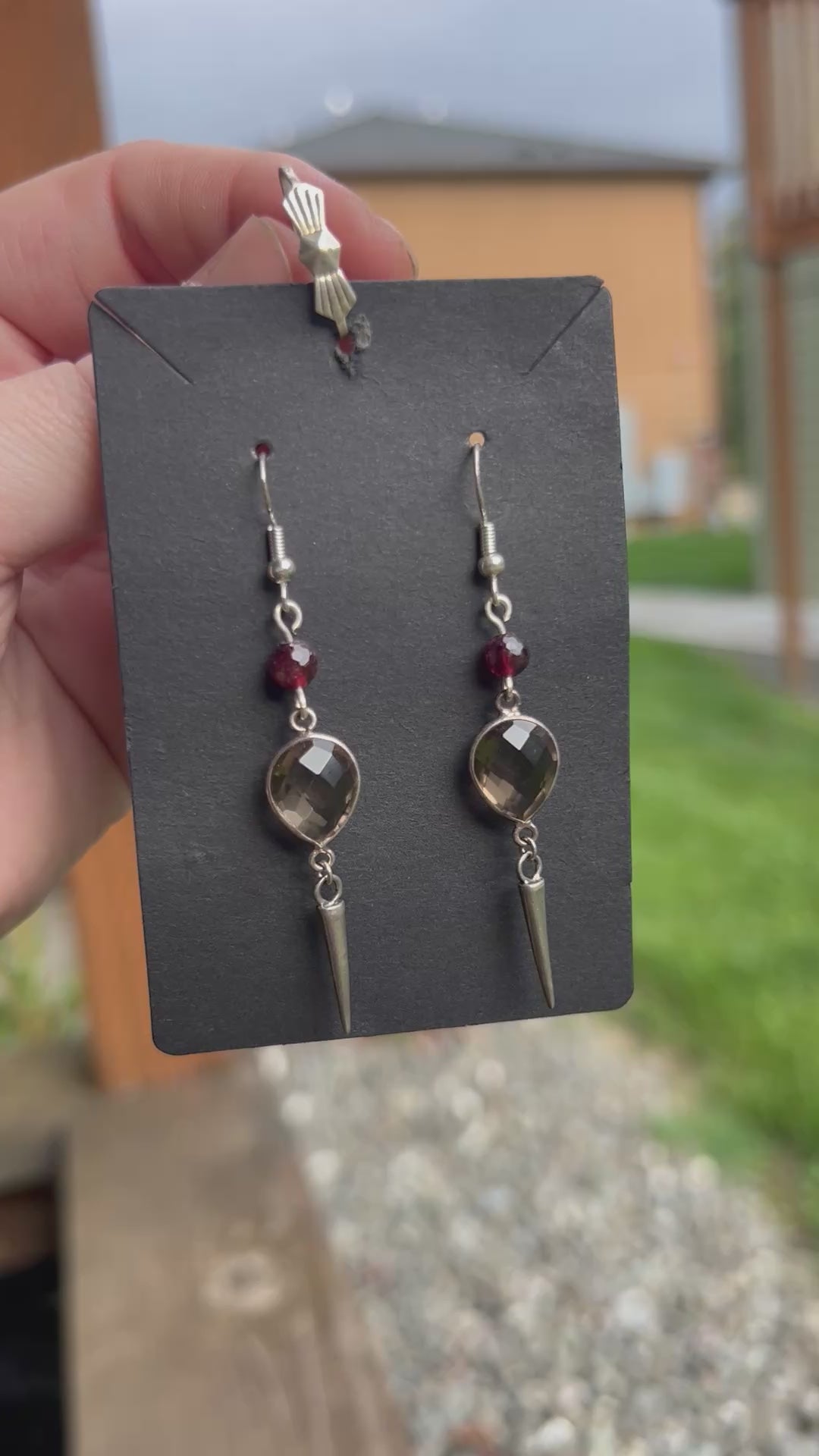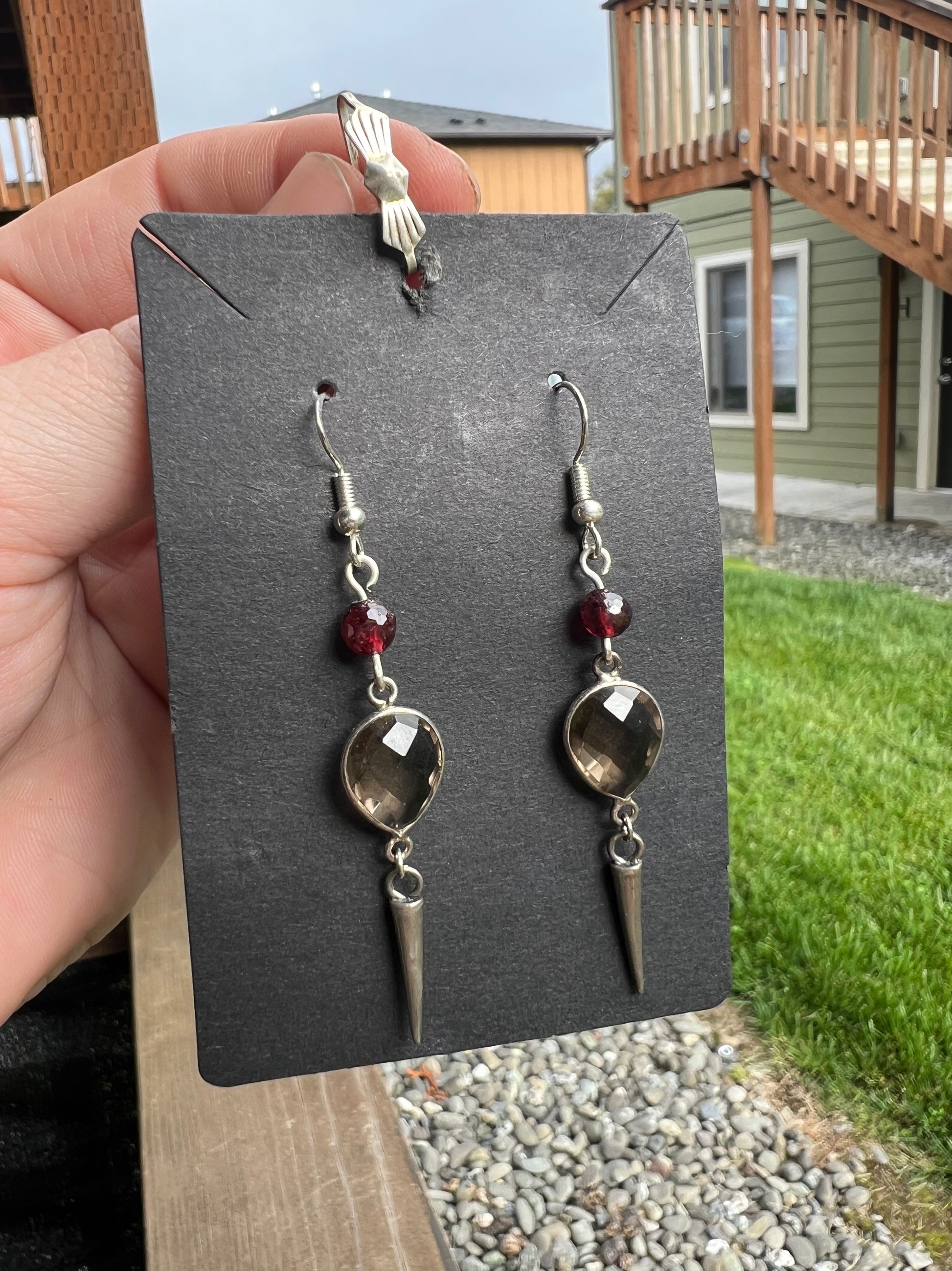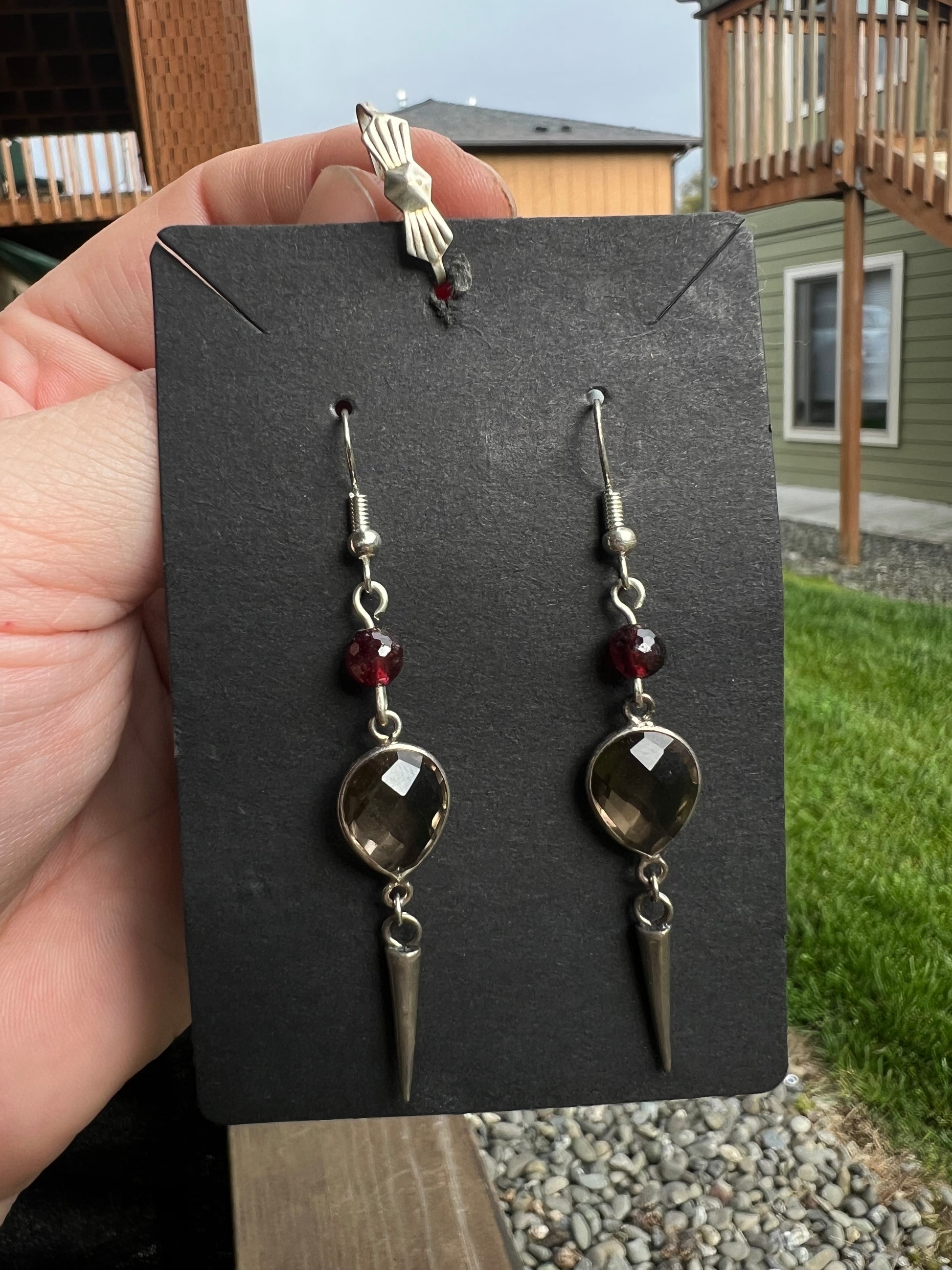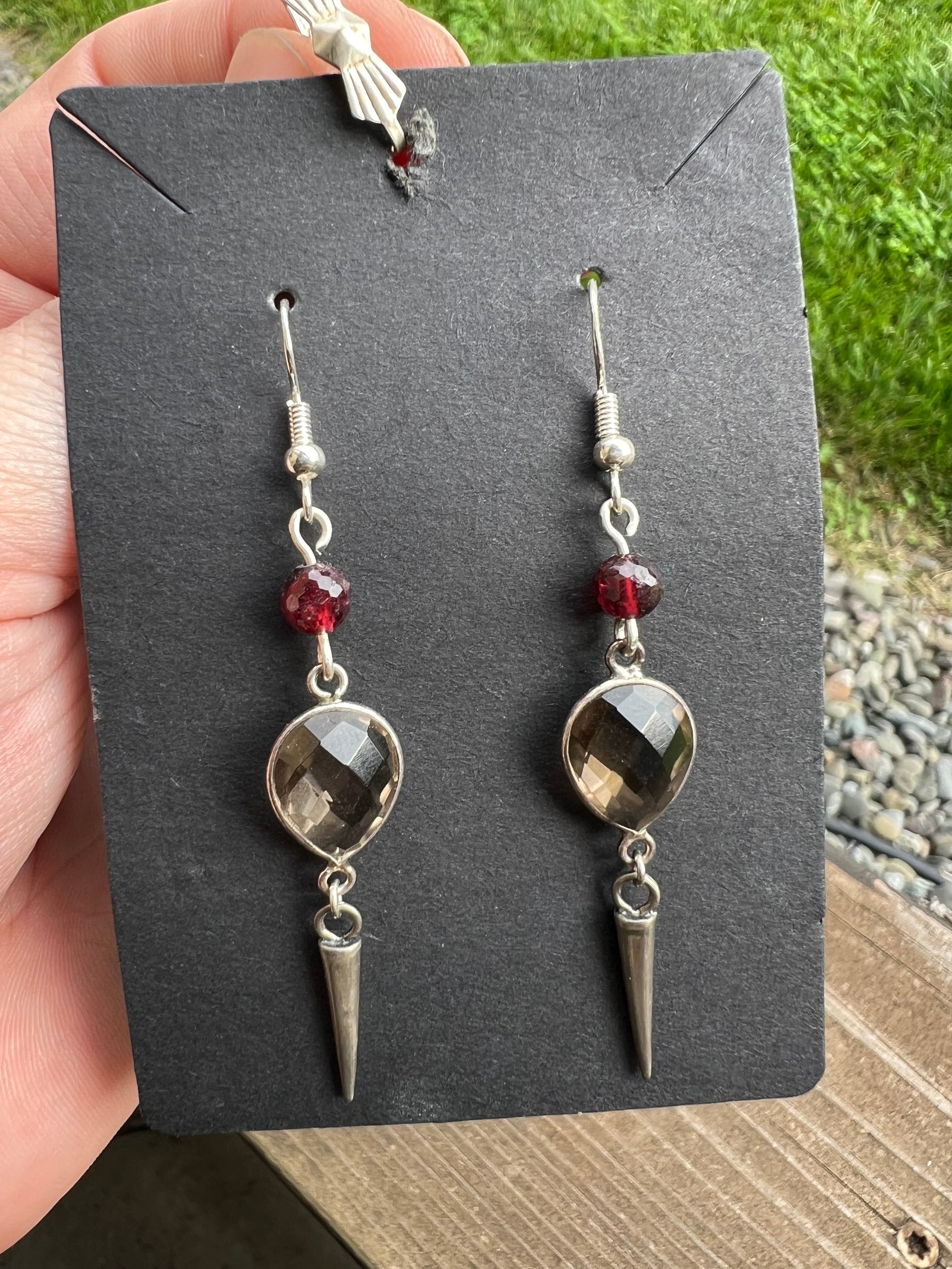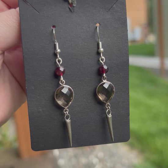 Gothic style earrings, sterling silver point charms, smoky quartz, and garnet, .925 hooks, light weight