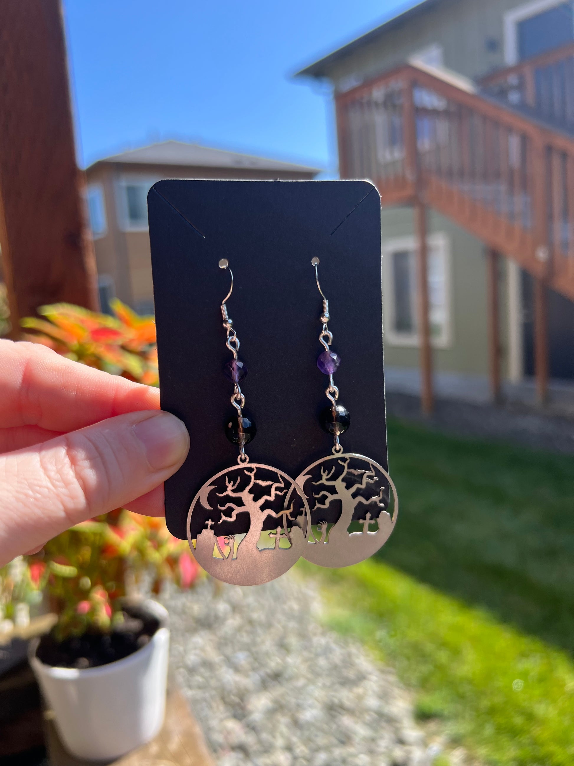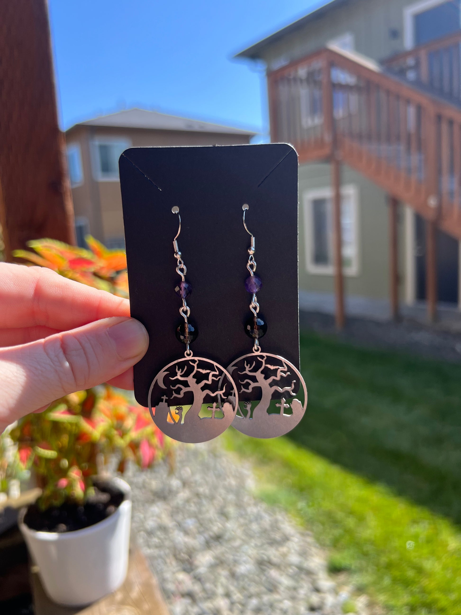 Graveyard charm earrings paired with Amethyst and Smoky Quartz, .925 hooks, light-medium weight