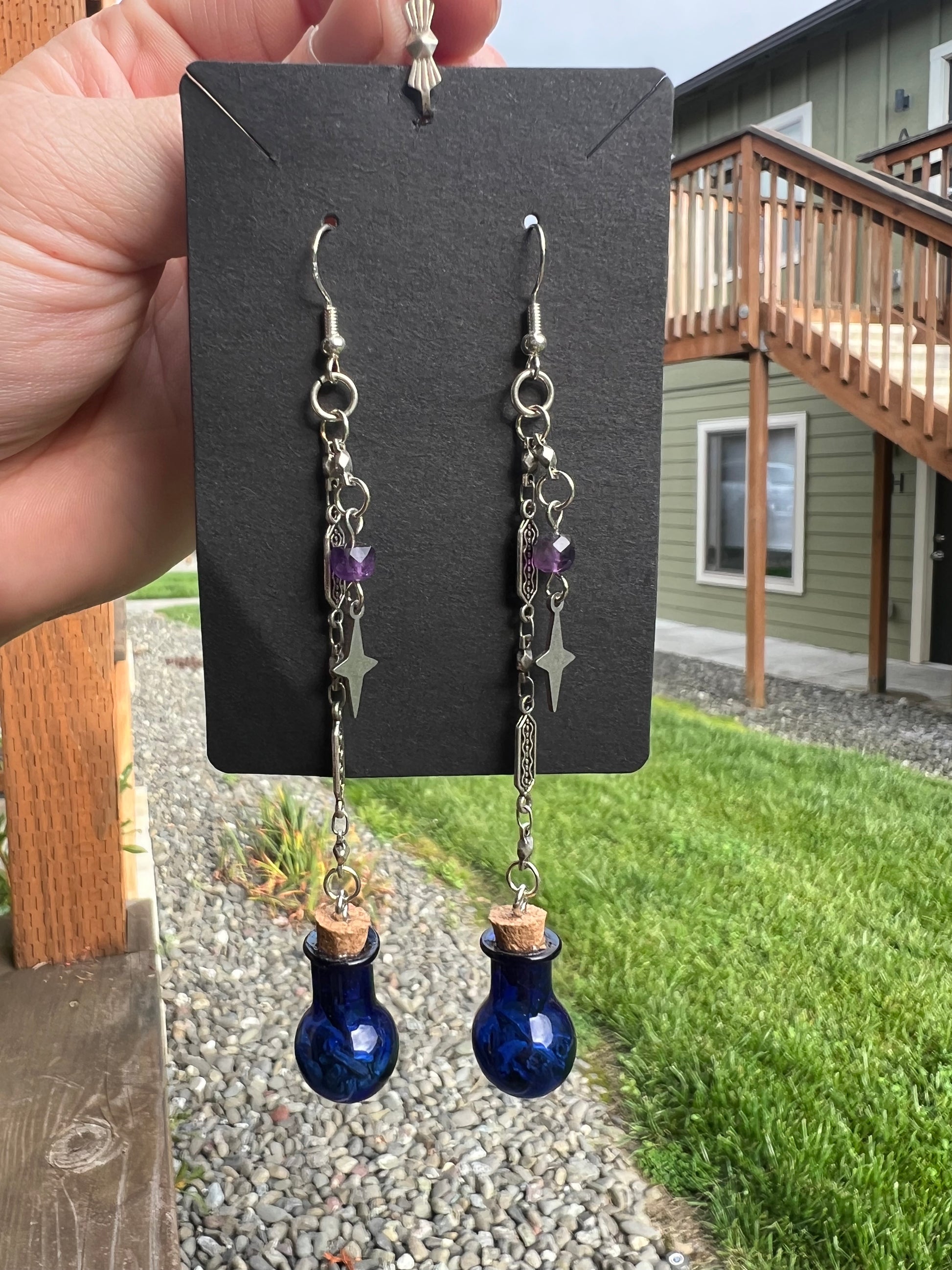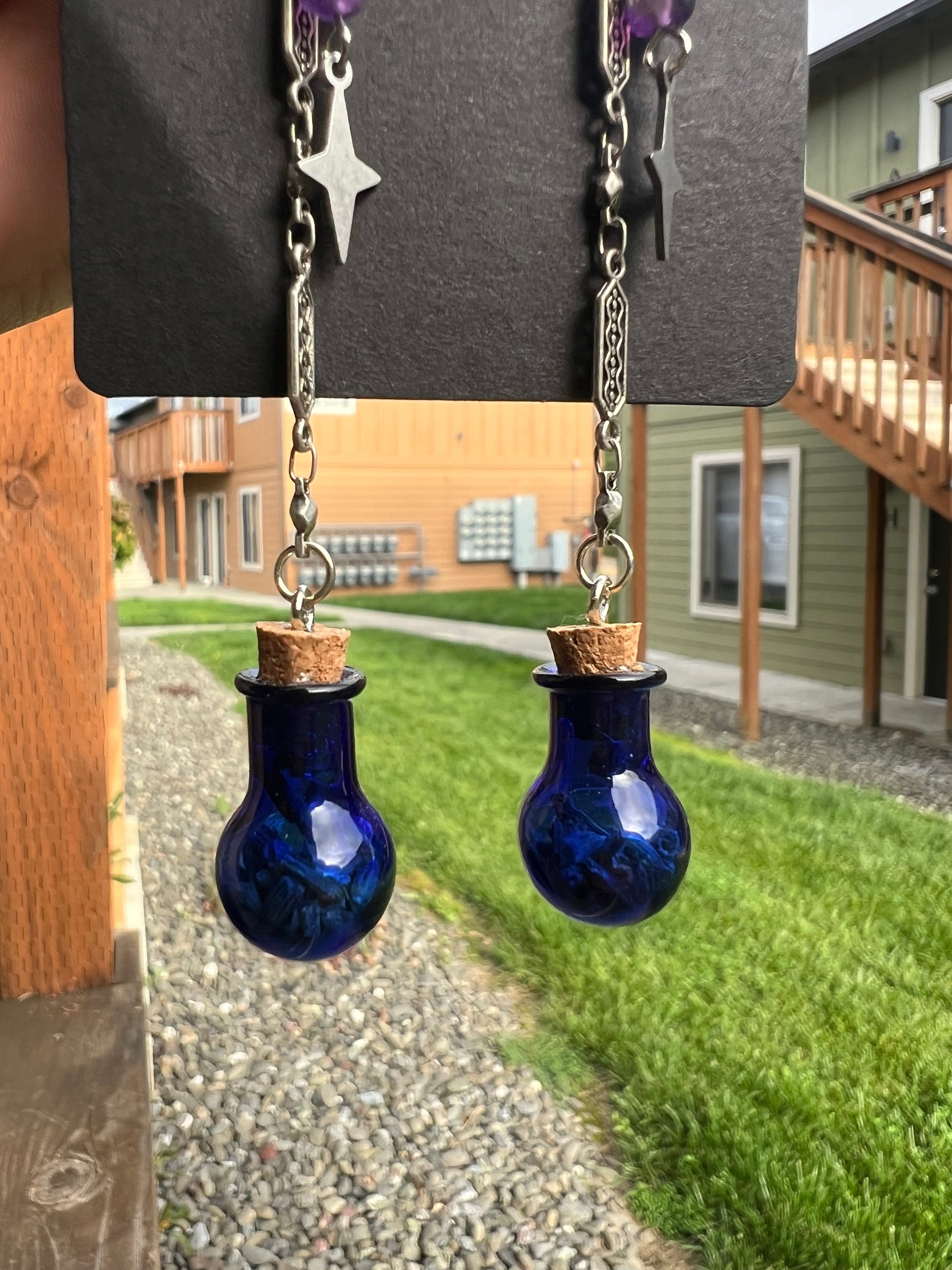 dangling earrings, real lavender encased in mini potion bottles, paired with star charms and amethyst beads, .925 hooks, medium weight, long