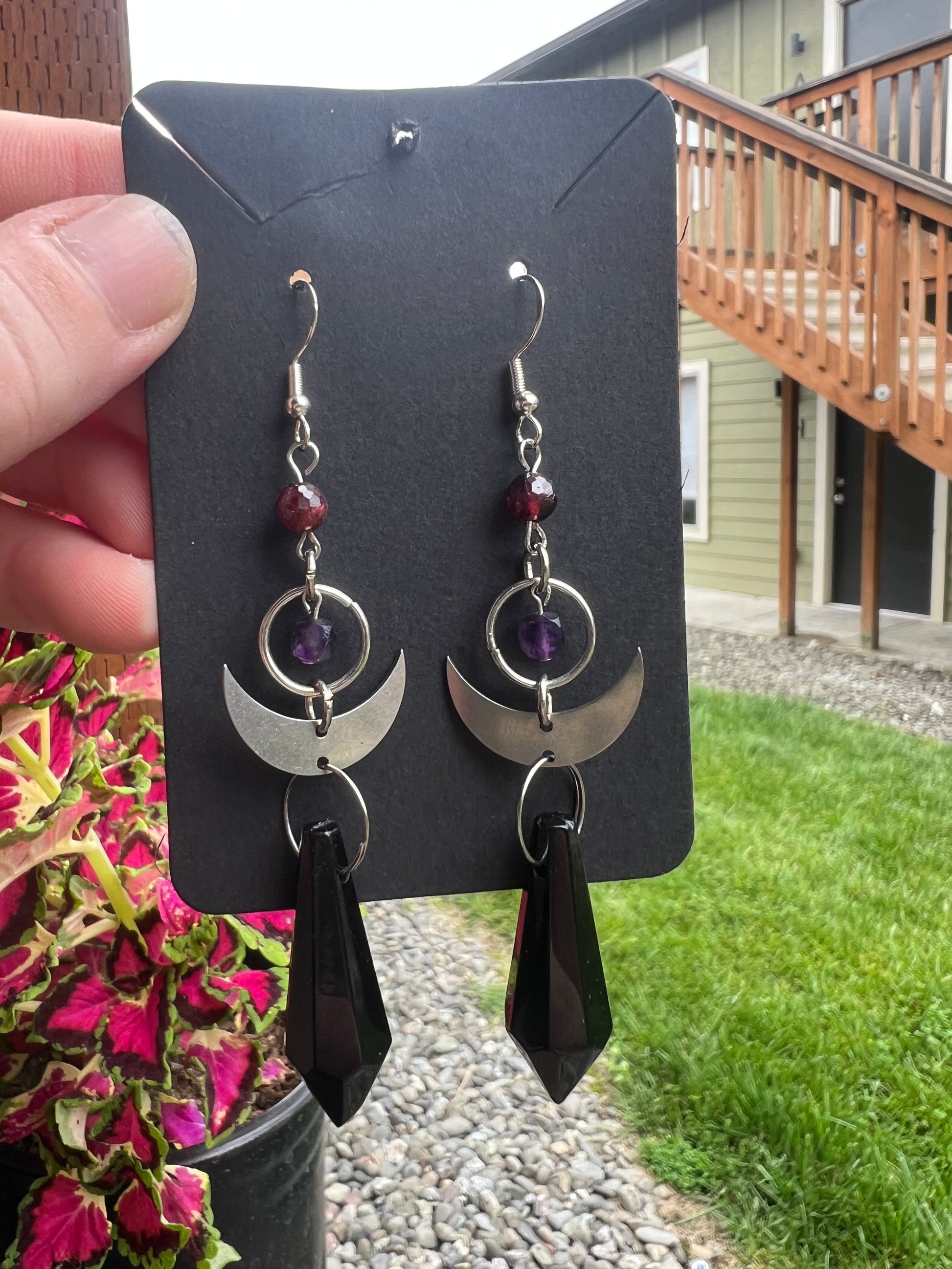 Gothic style earrings with black chandelier beads, garnet and amethyst, .925 hooks, medium weight