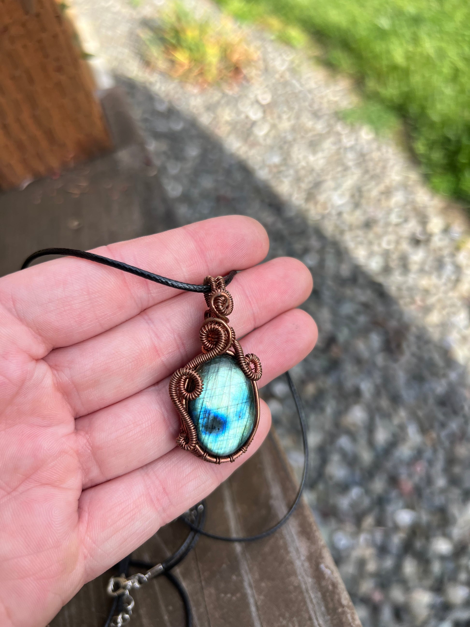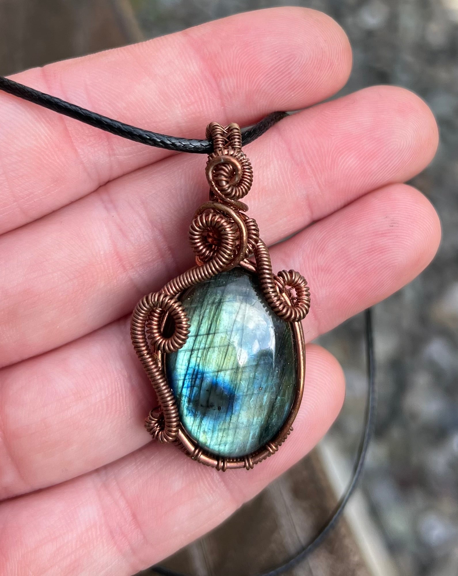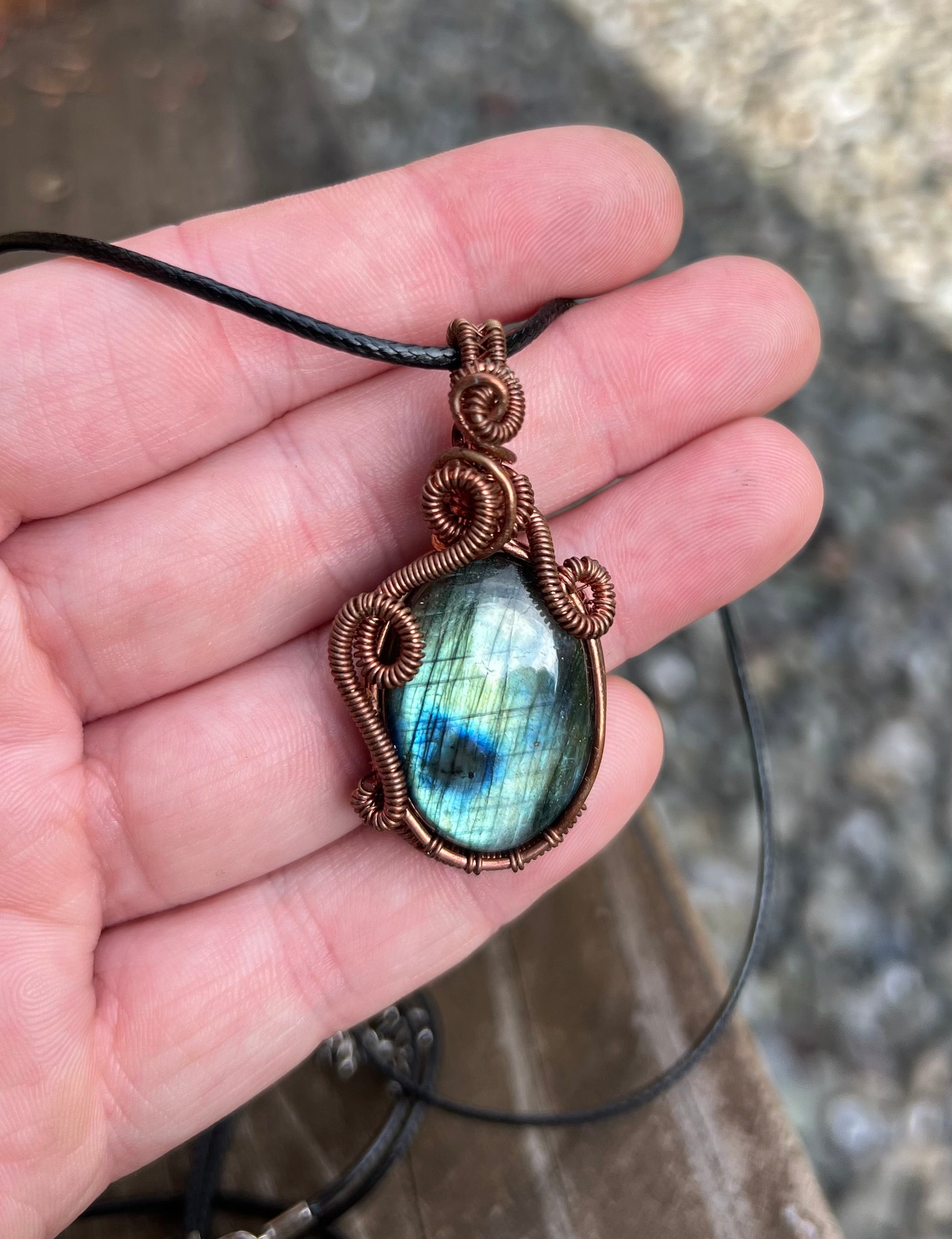 Labradorite pendant wrapped in copper wire, comes with necklace cording