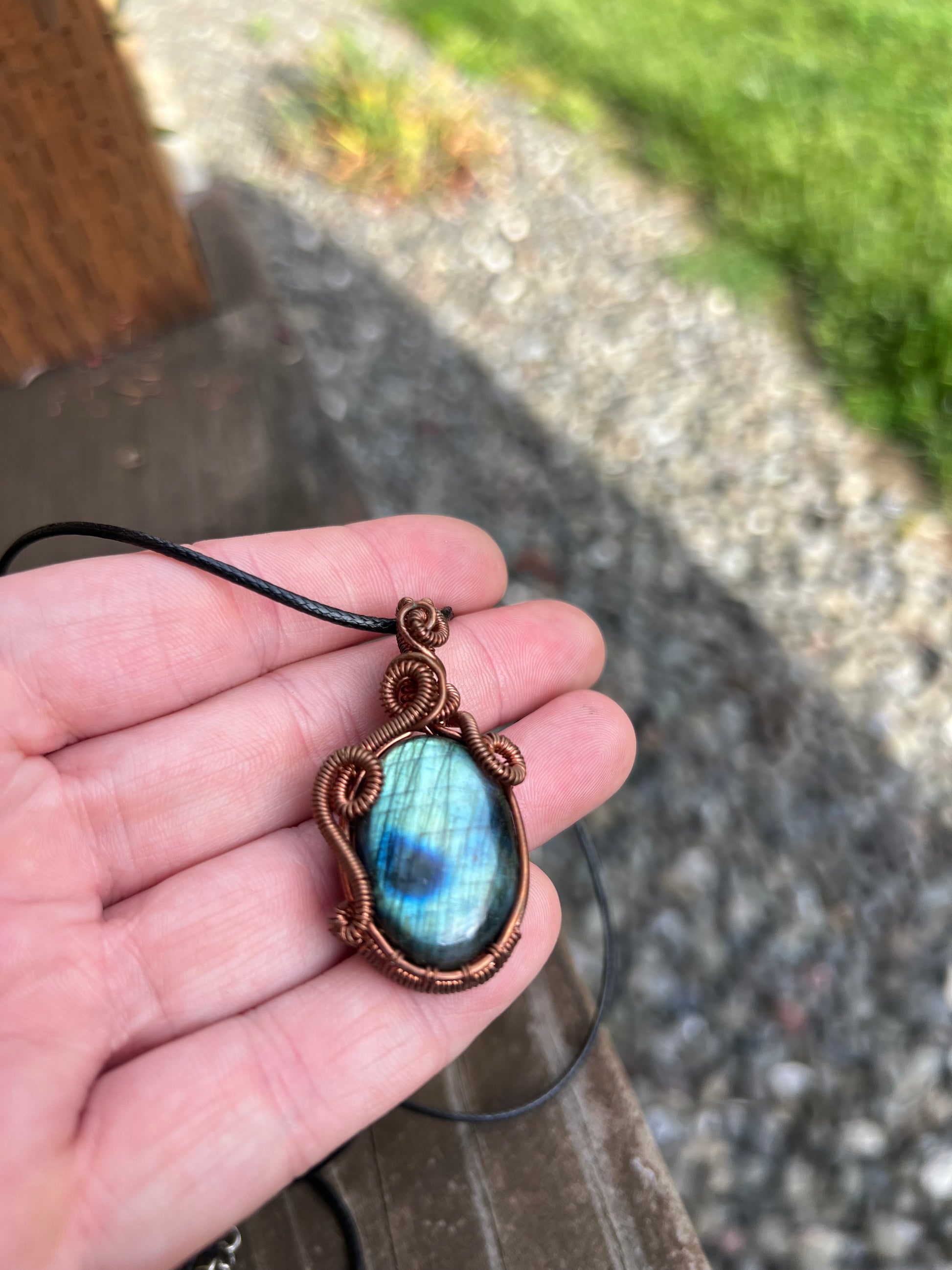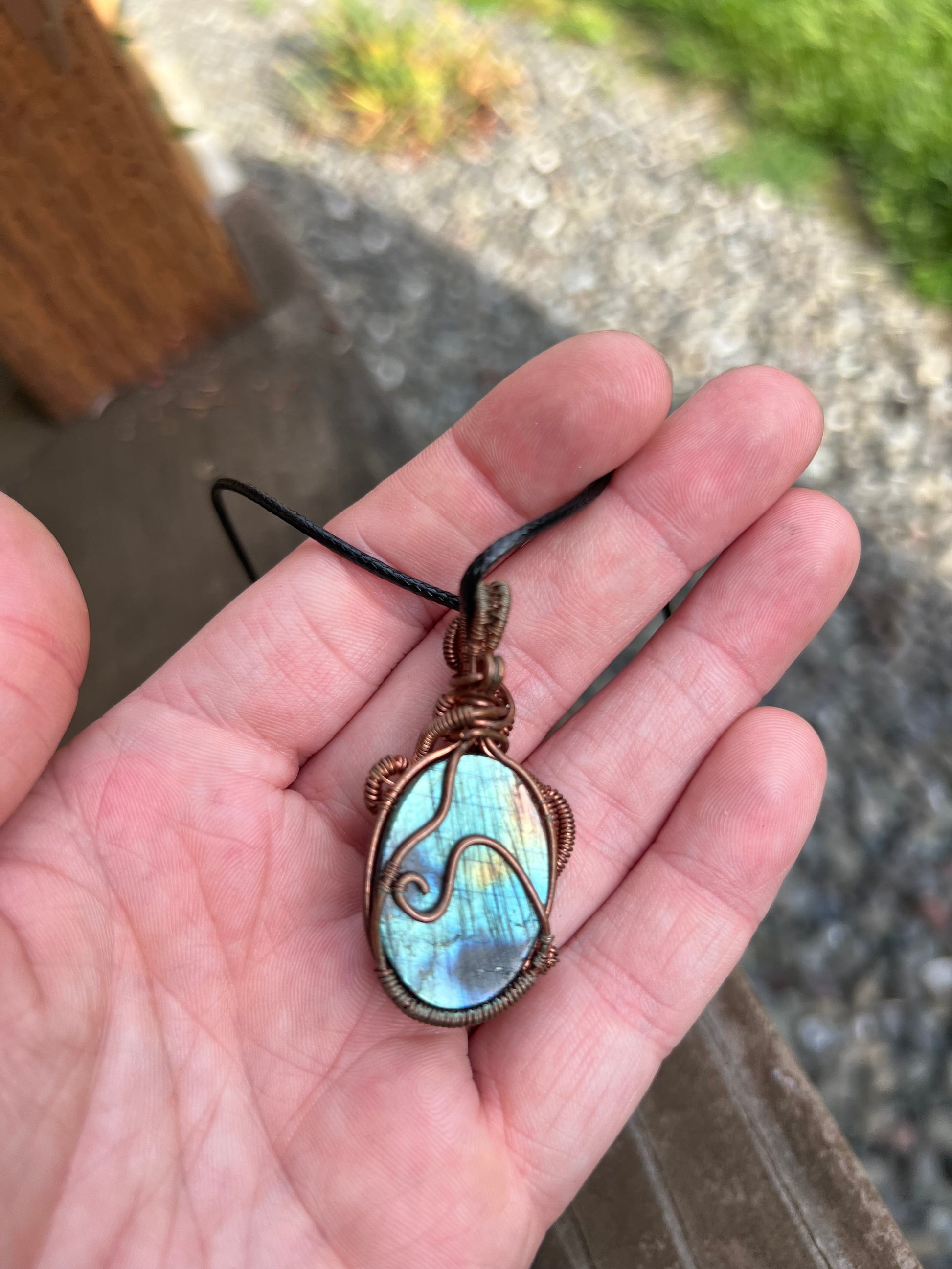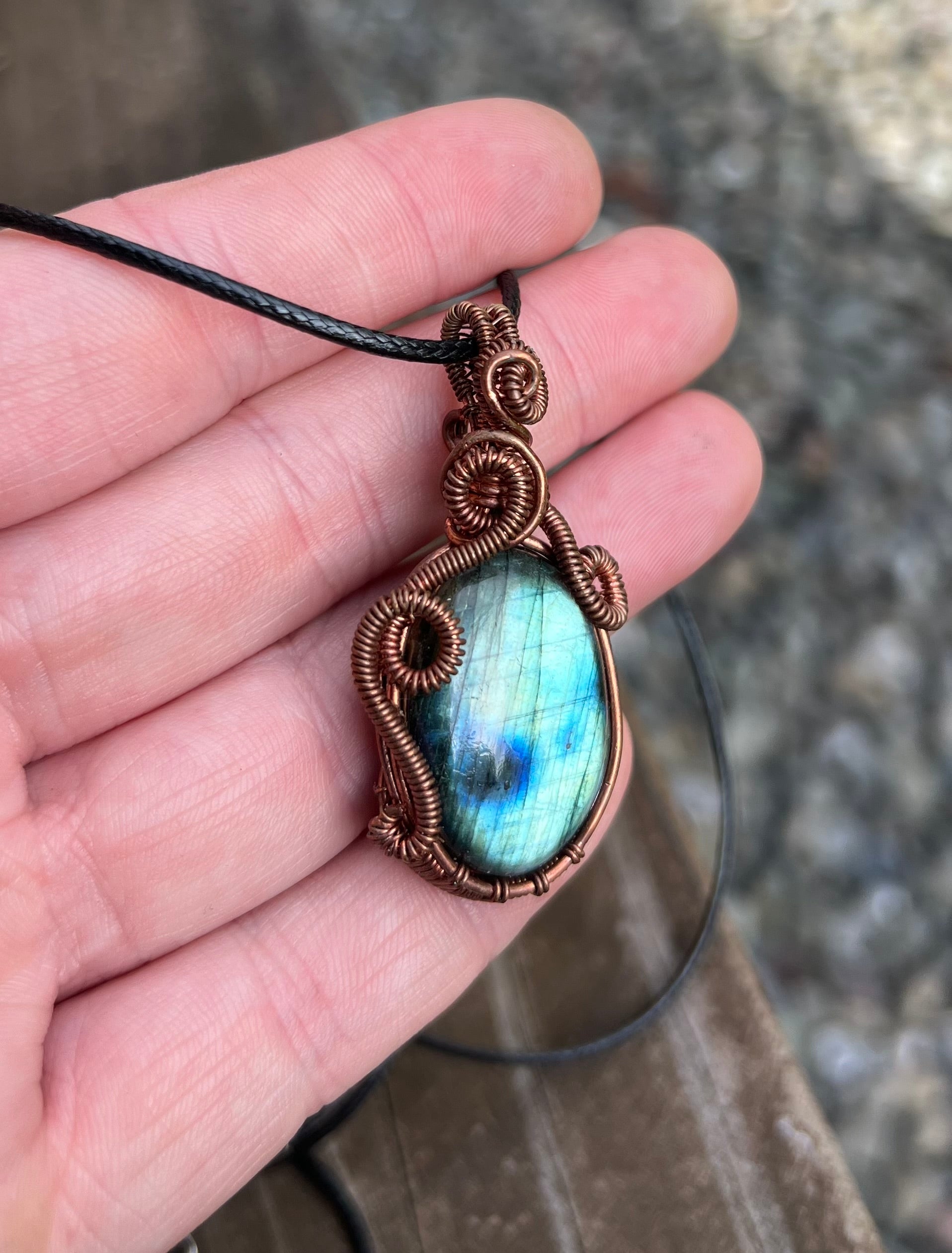Labradorite pendant wrapped in copper wire, comes with necklace cording