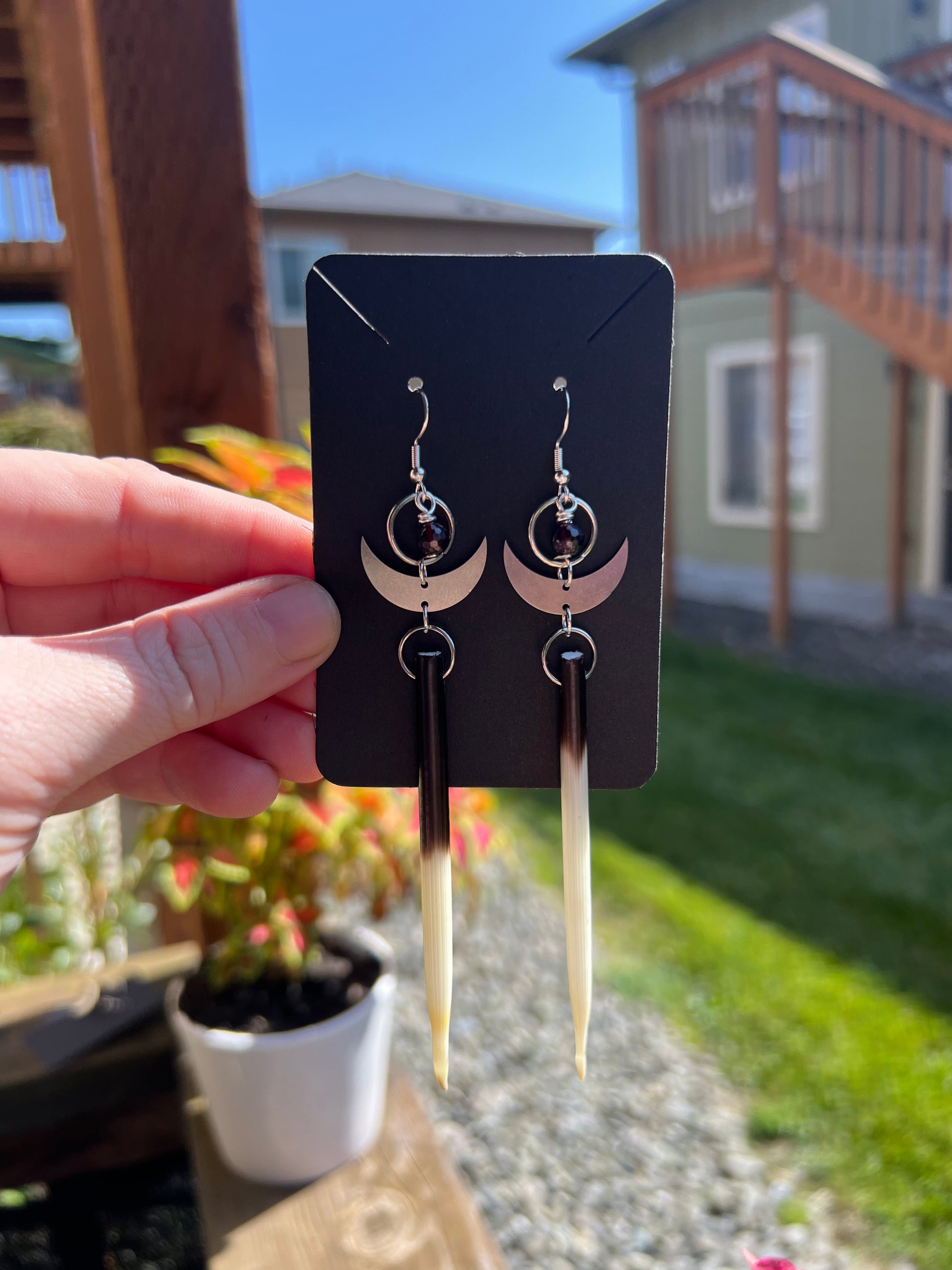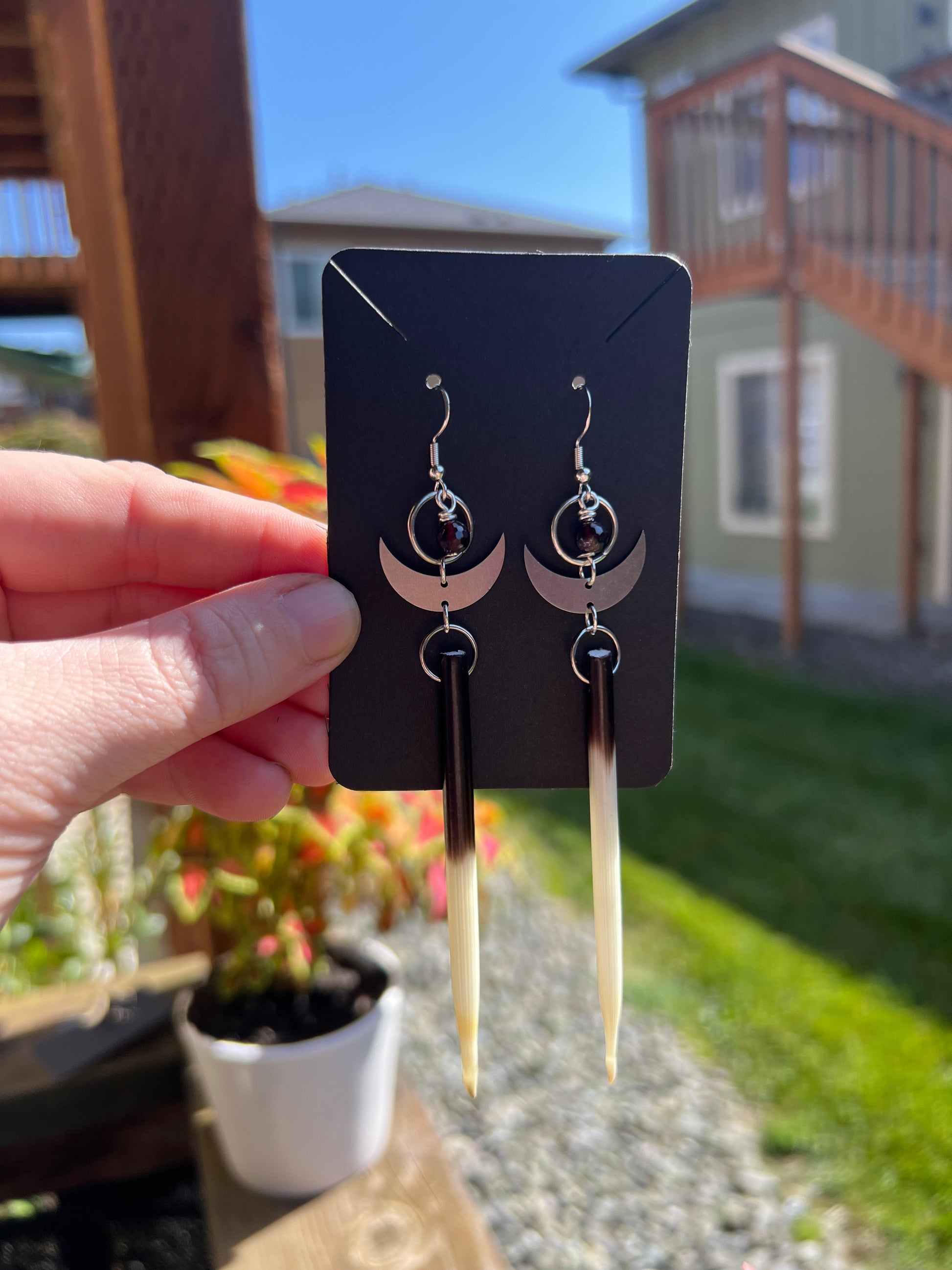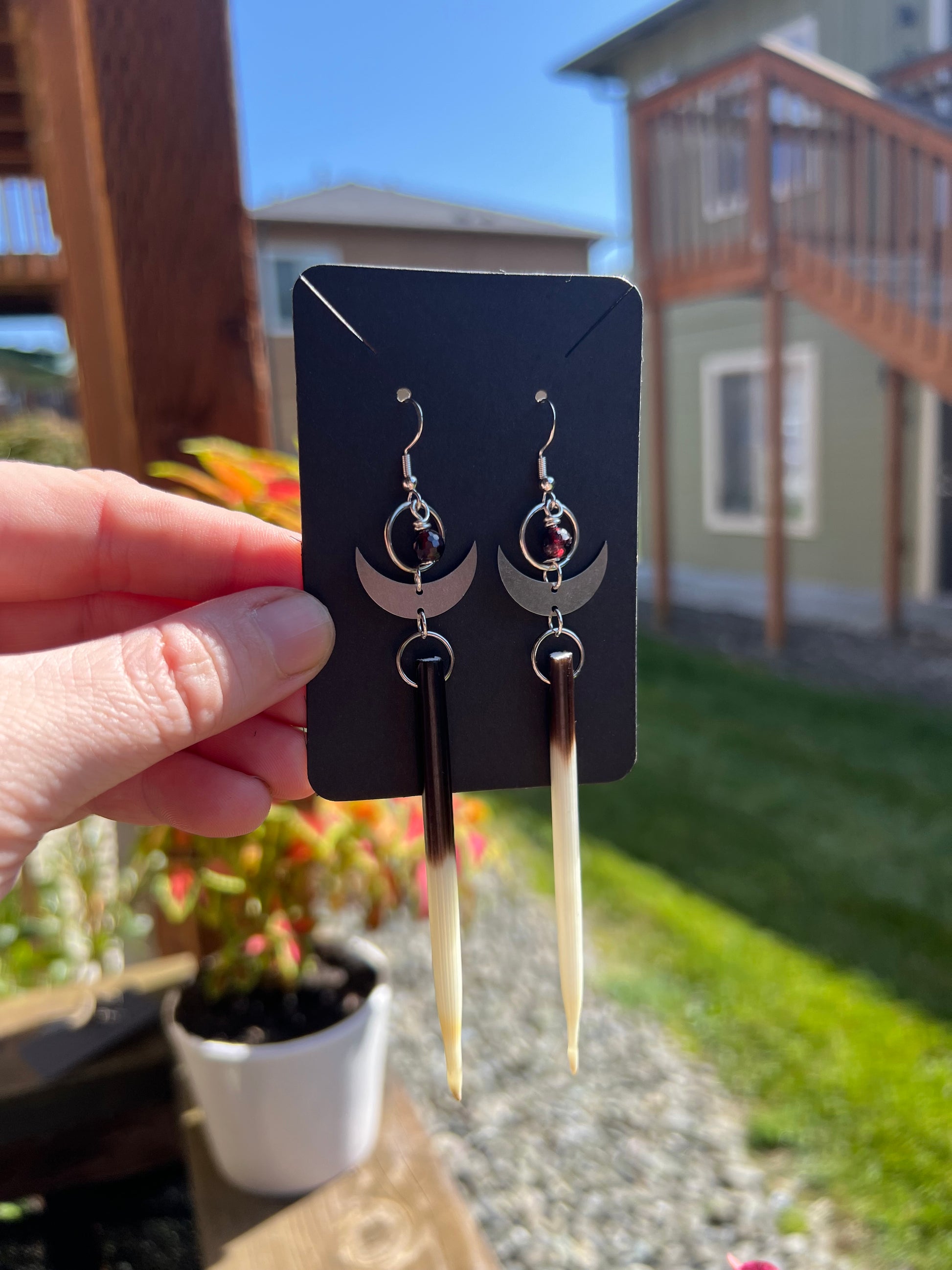 Porcupine quill earrings paired with silver moon charms and Garnet, .925 hooks, light-medium weight