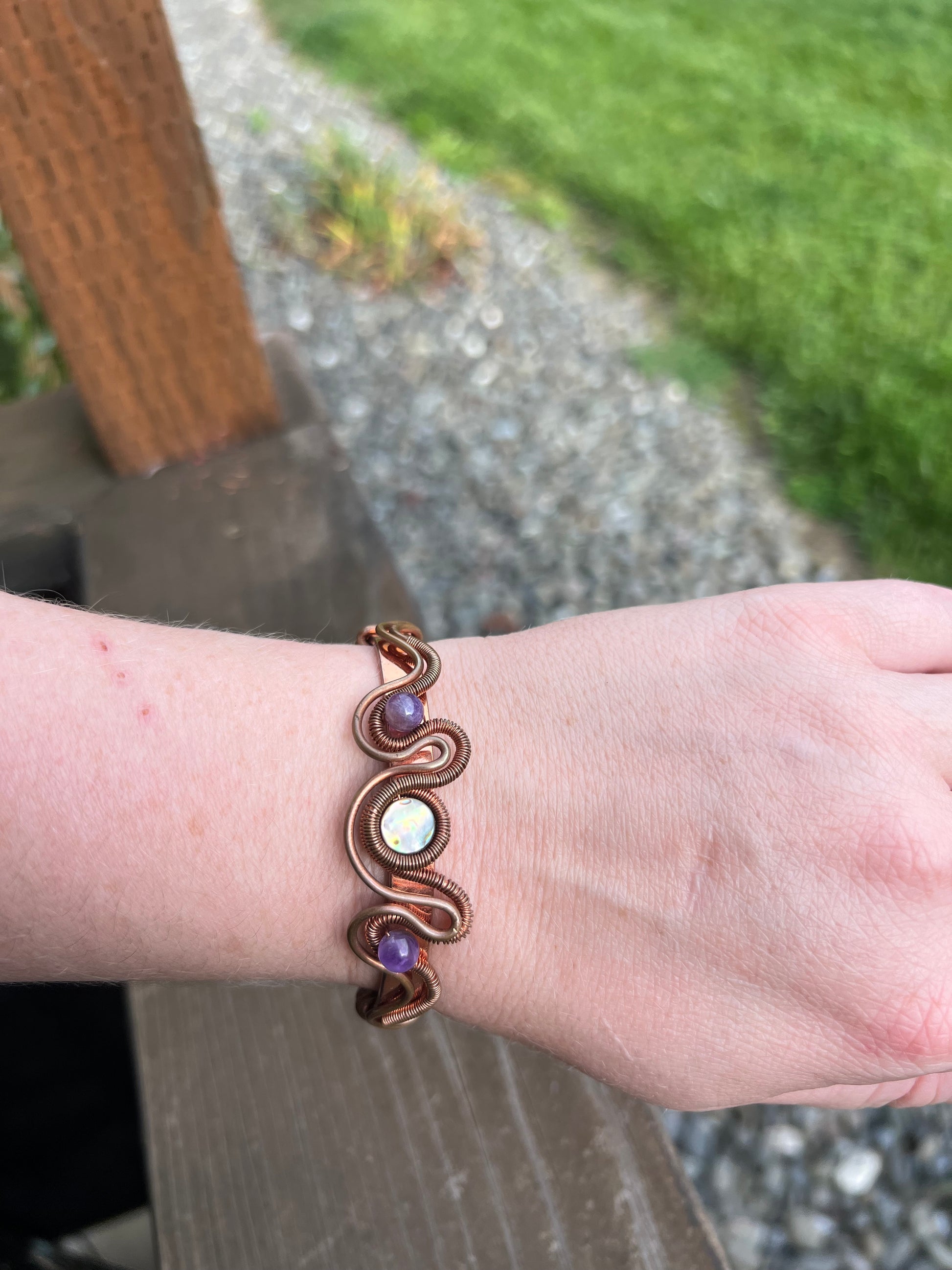 Amethyst and Abalone Bracelet wrapped in copper, adjustable