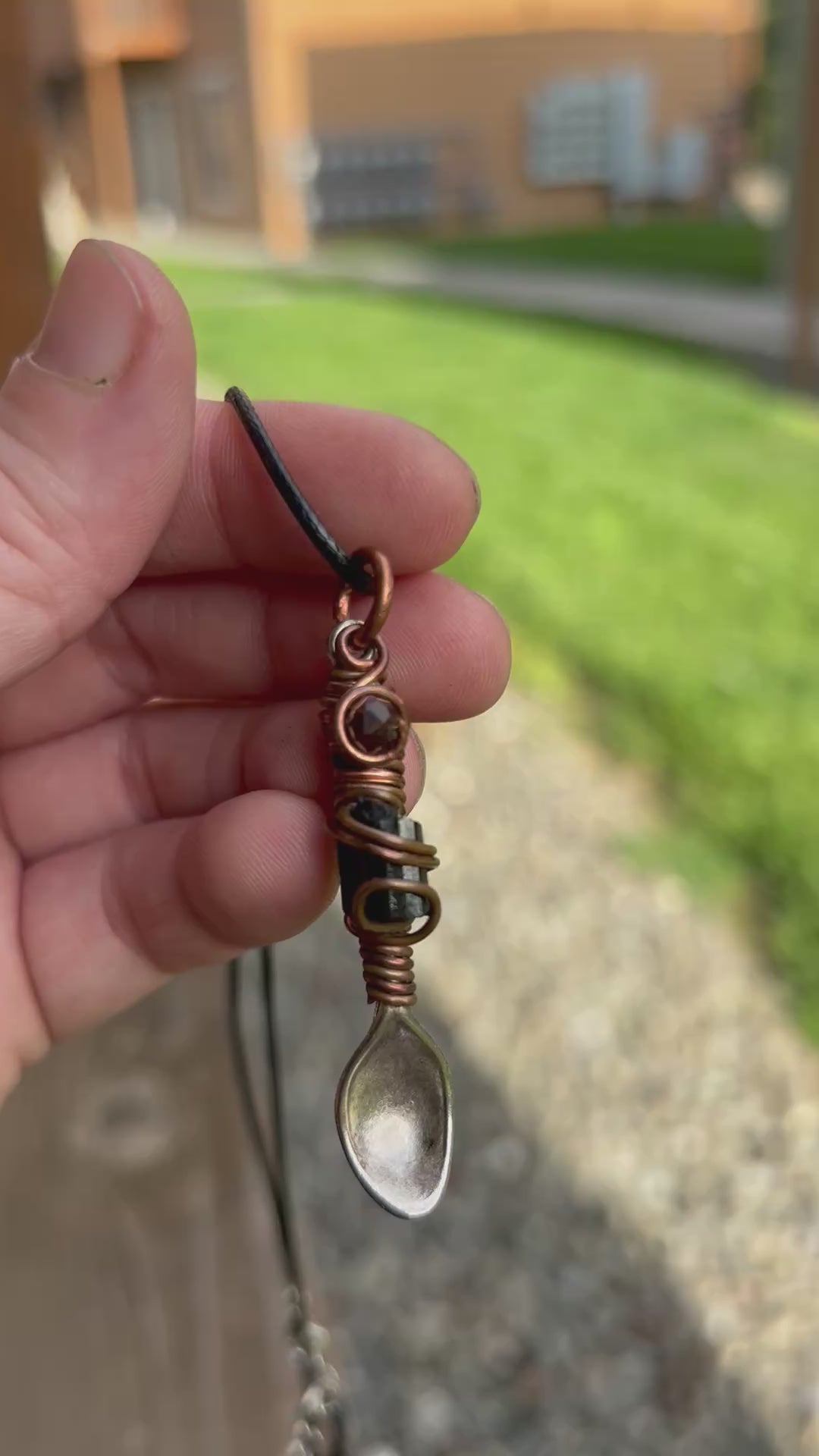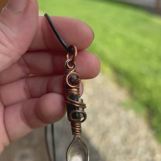 Spoon Pendant, wrapped with copper wire and paired with garnet and black tourmaline, comes with necklace cording