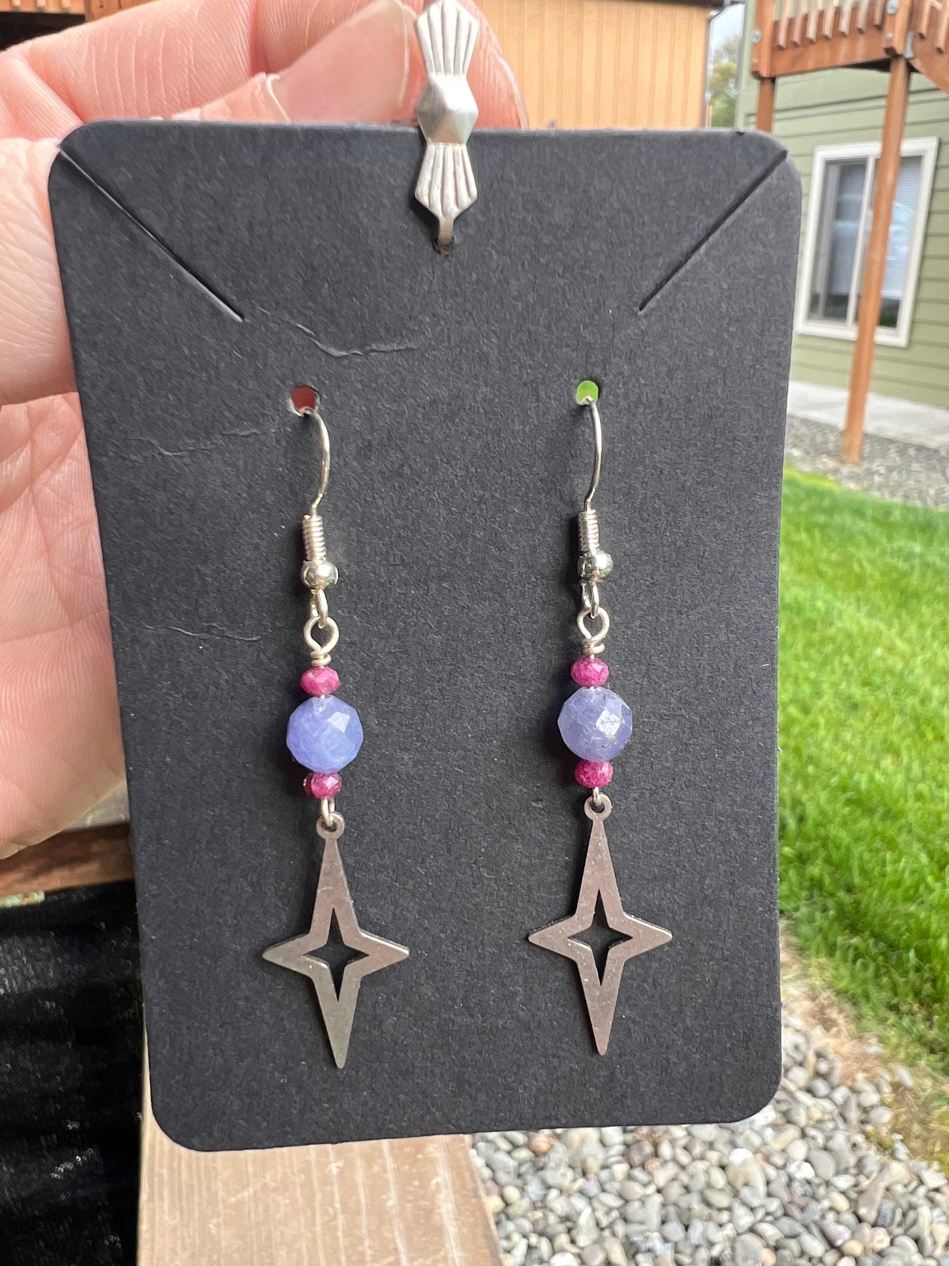 Star charm earrings, Tanzanite and Ruby beads, .925 hooks, light weight
