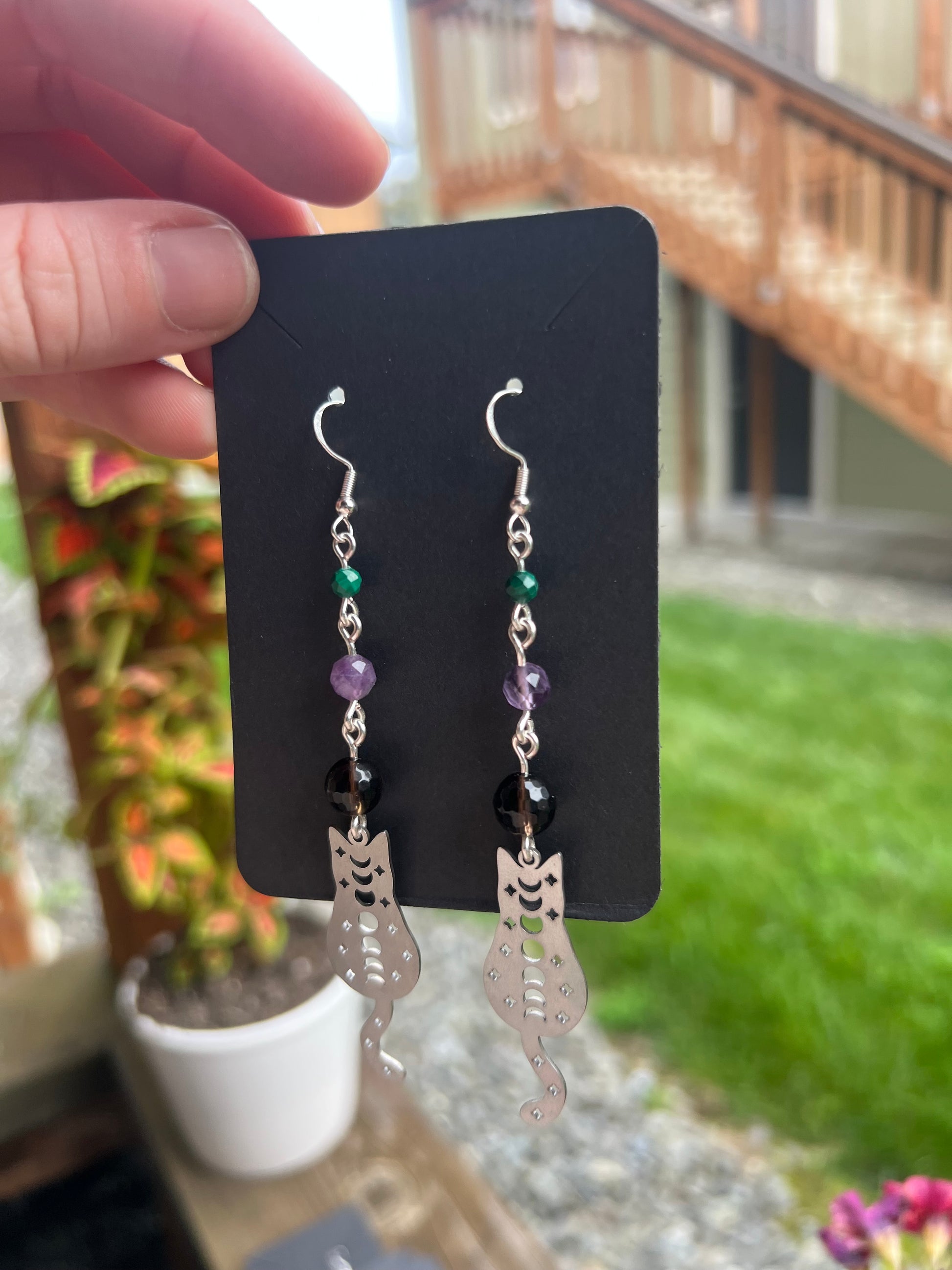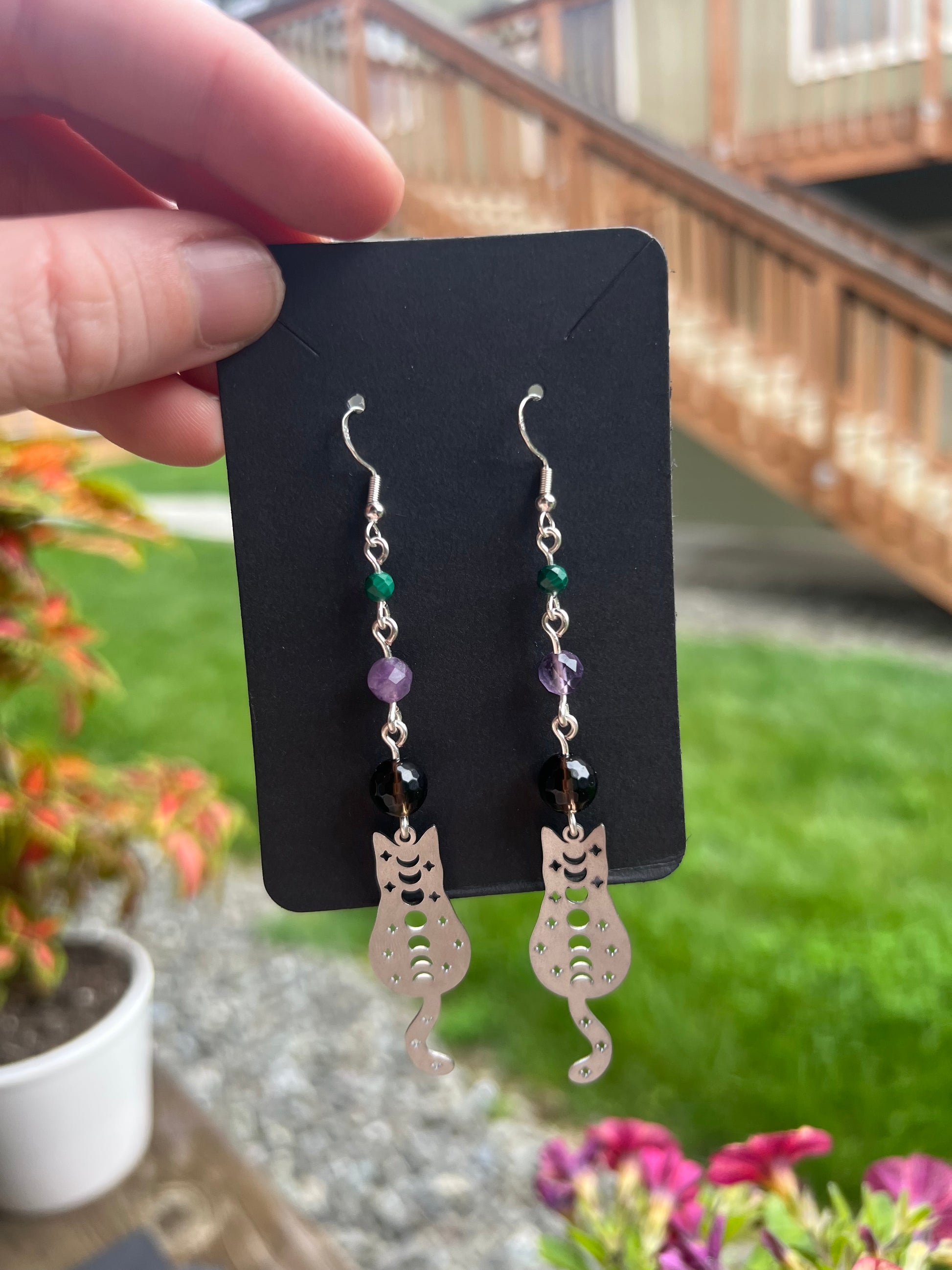 Cat Charm earrings paired with amethyst, malachite and smoky quartz beads, .925 hooks, light/medium weight