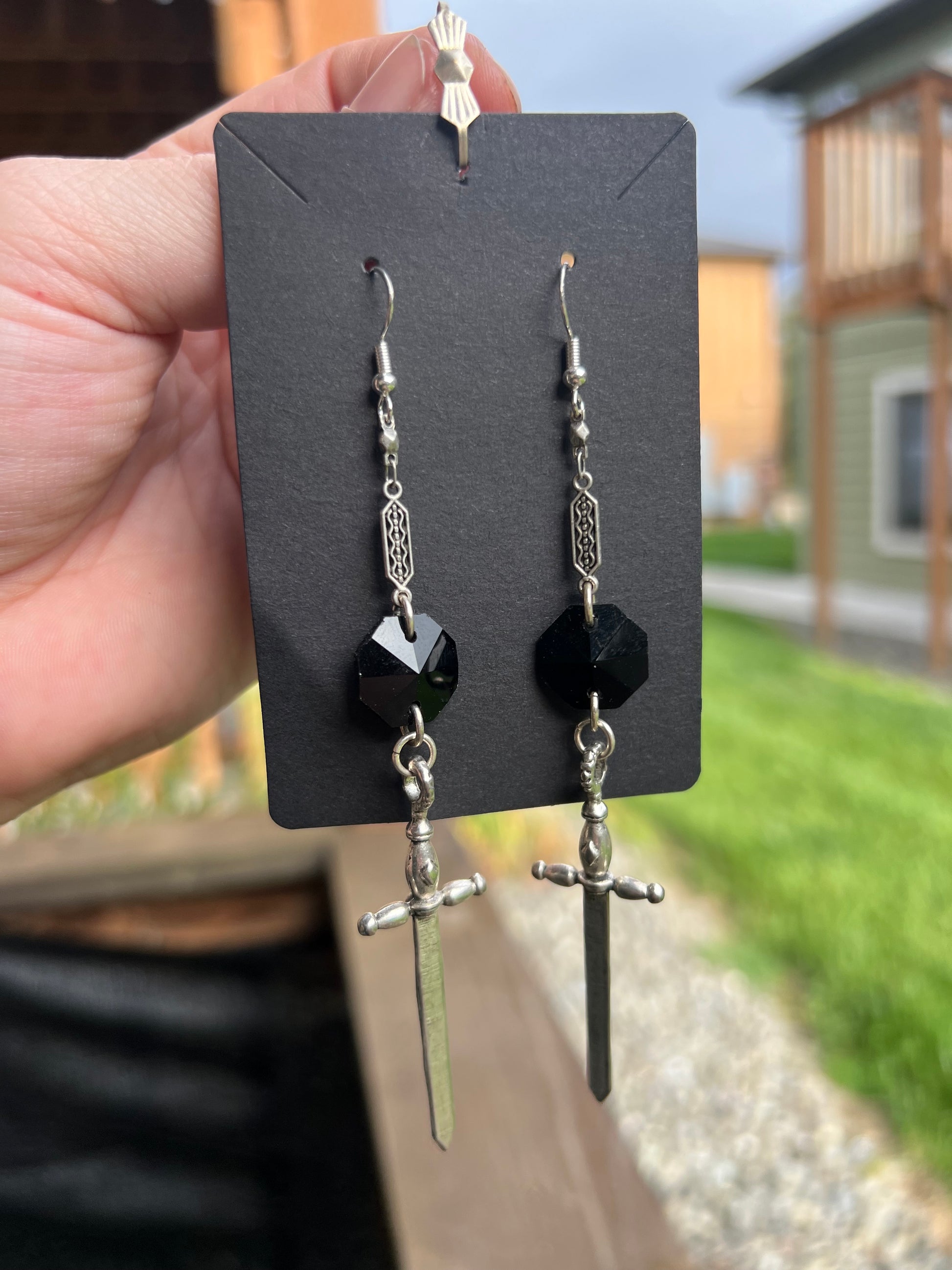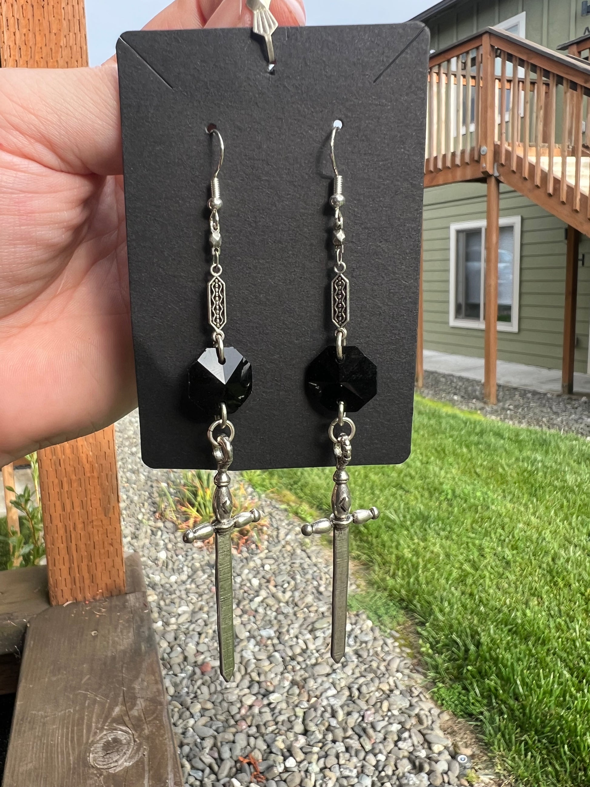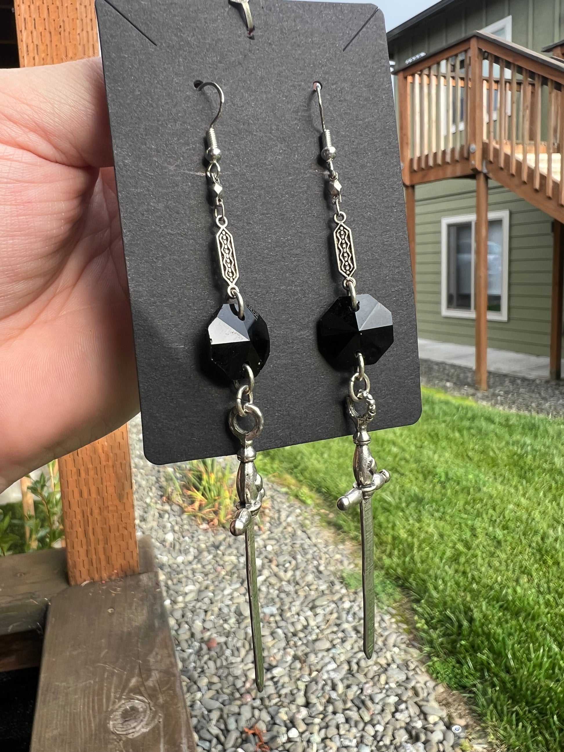 Silver sword charms paired with black beads, .925 hooks, medium weight