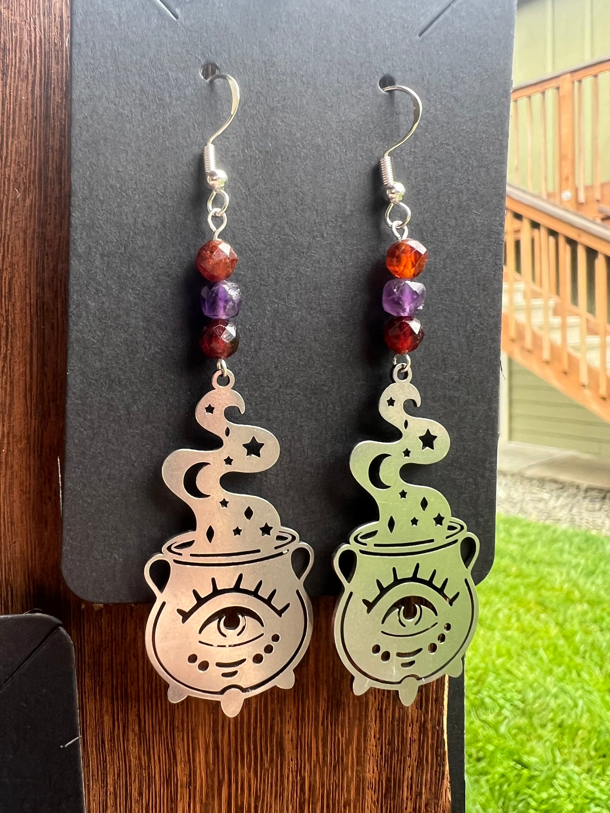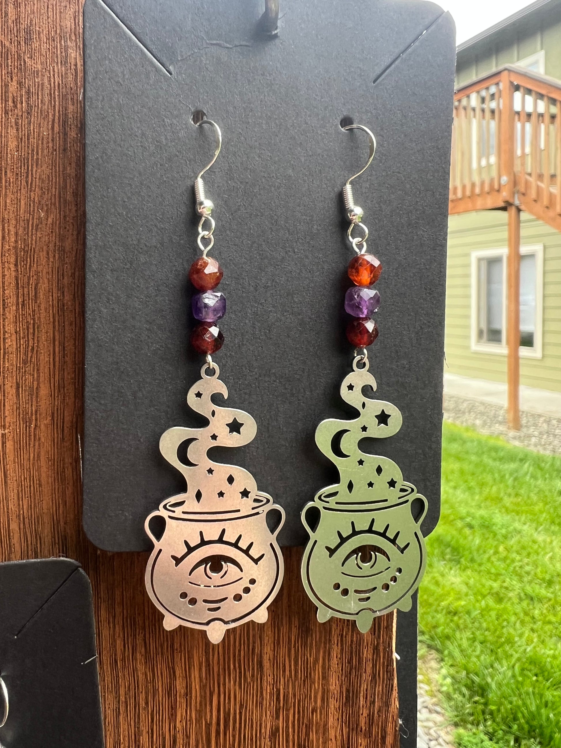 Cauldron charm earrings paired with garnet and amethyst, .925 hooks, medium weight