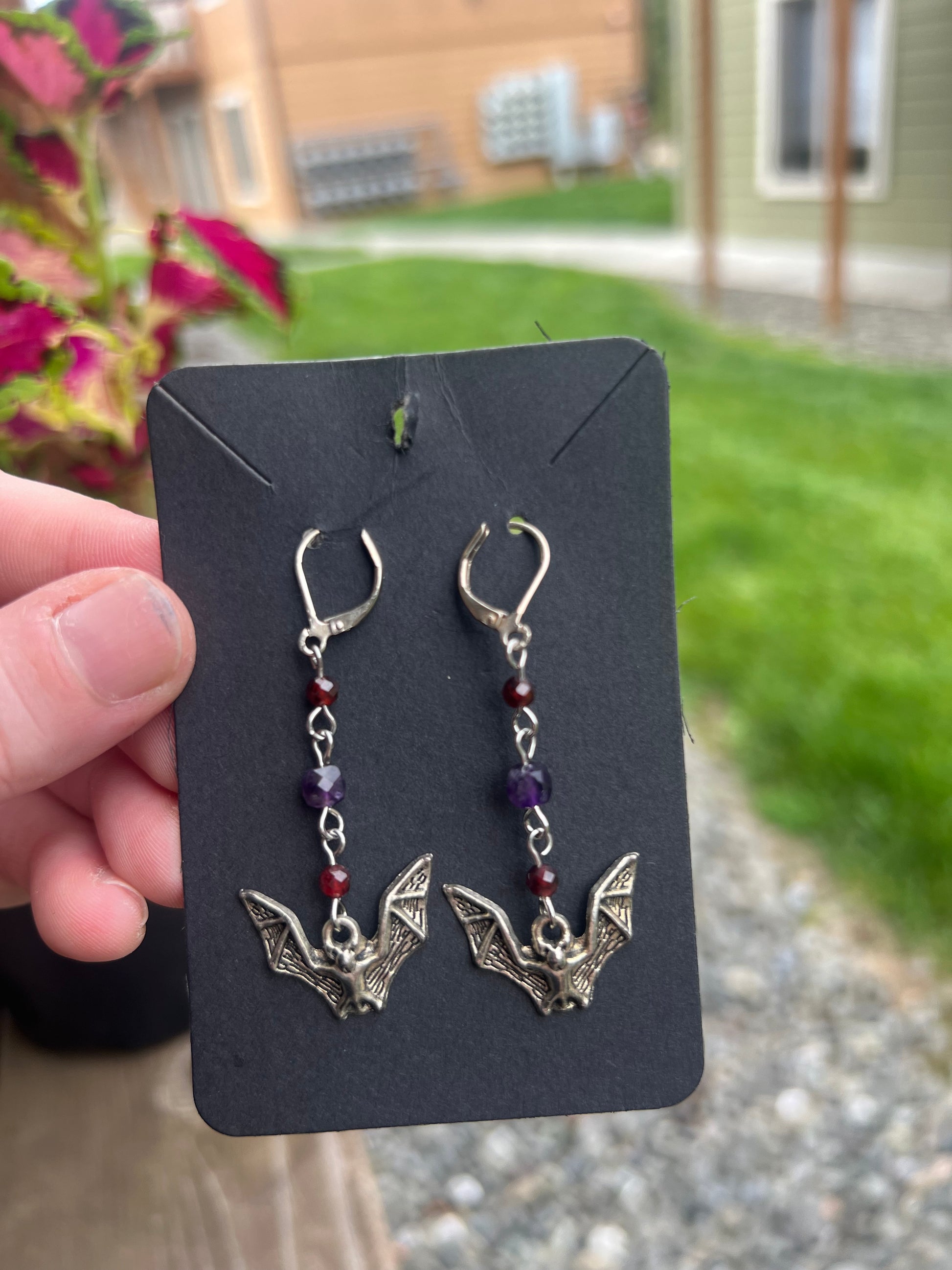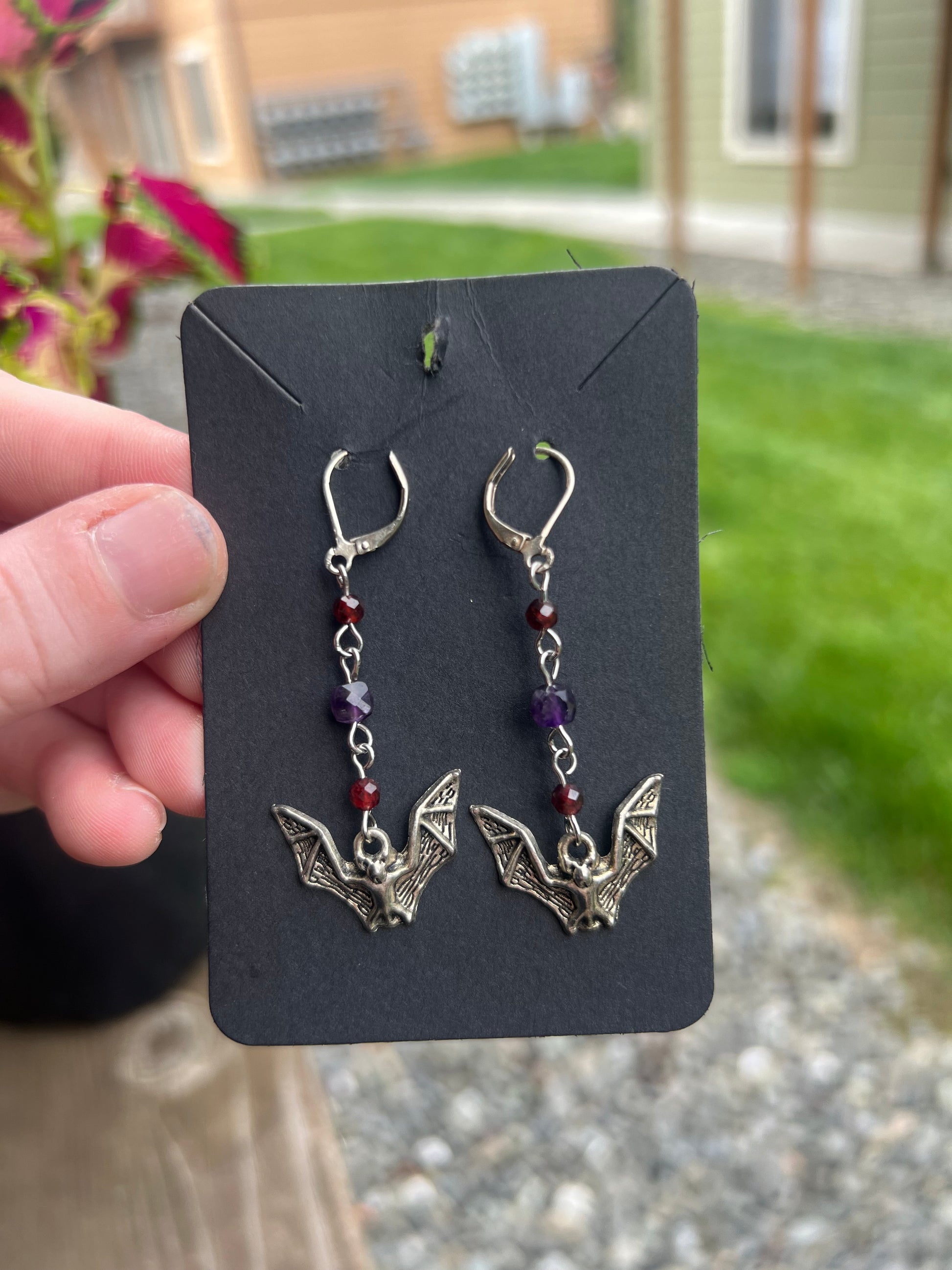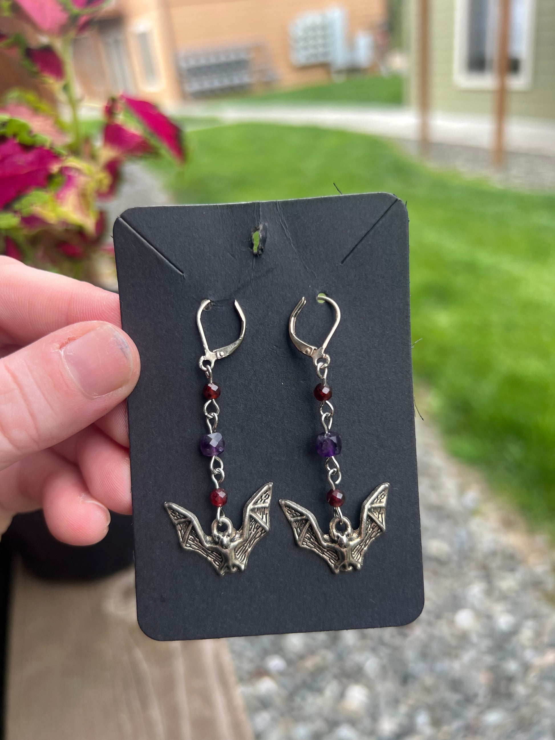 Bat earrings paired with garnet and amethyst, .925 earrings, light-medium weight